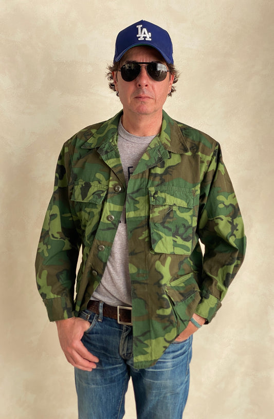 Med Short. Authentic 1977 US Army vintage camouflage jungle jacket.