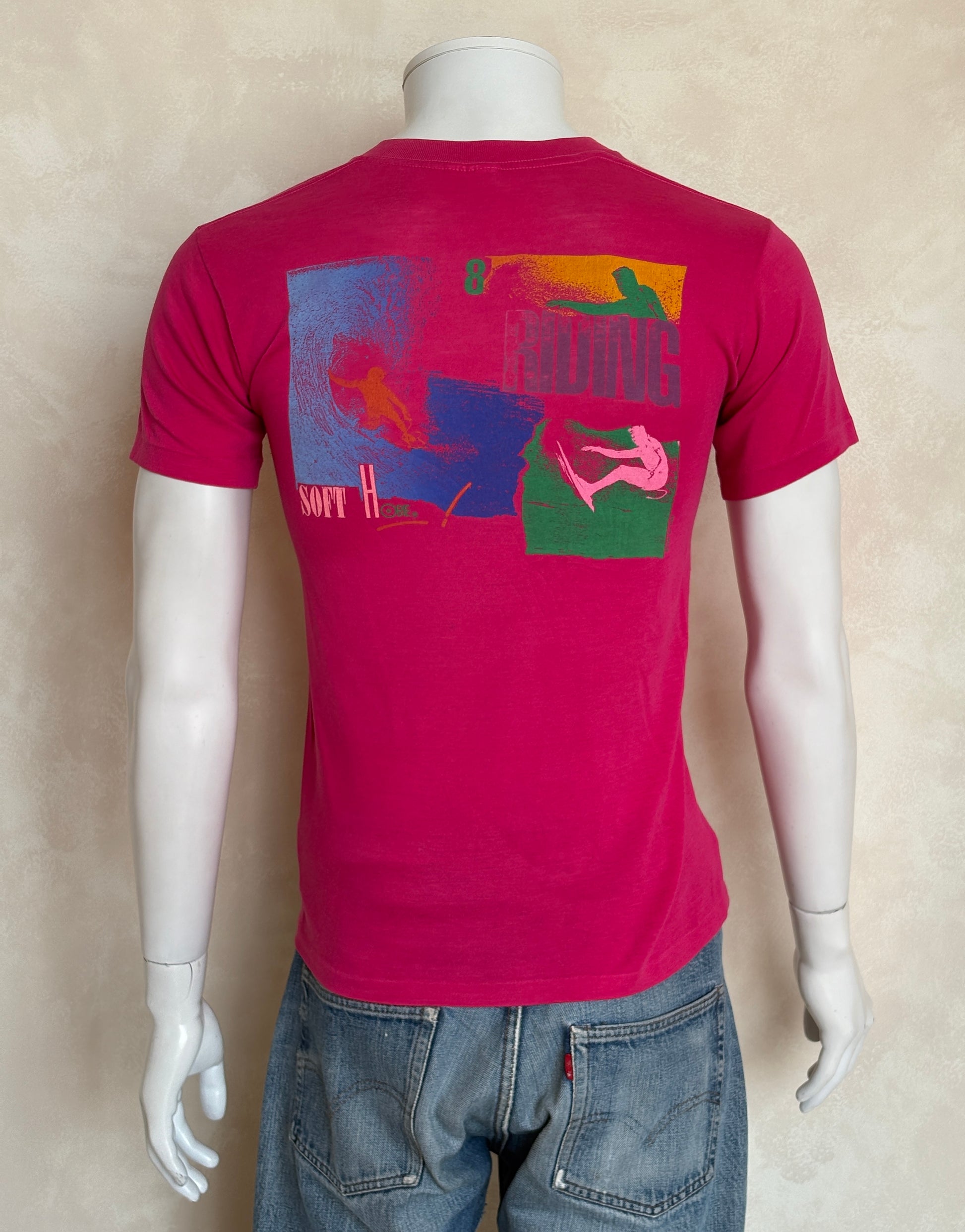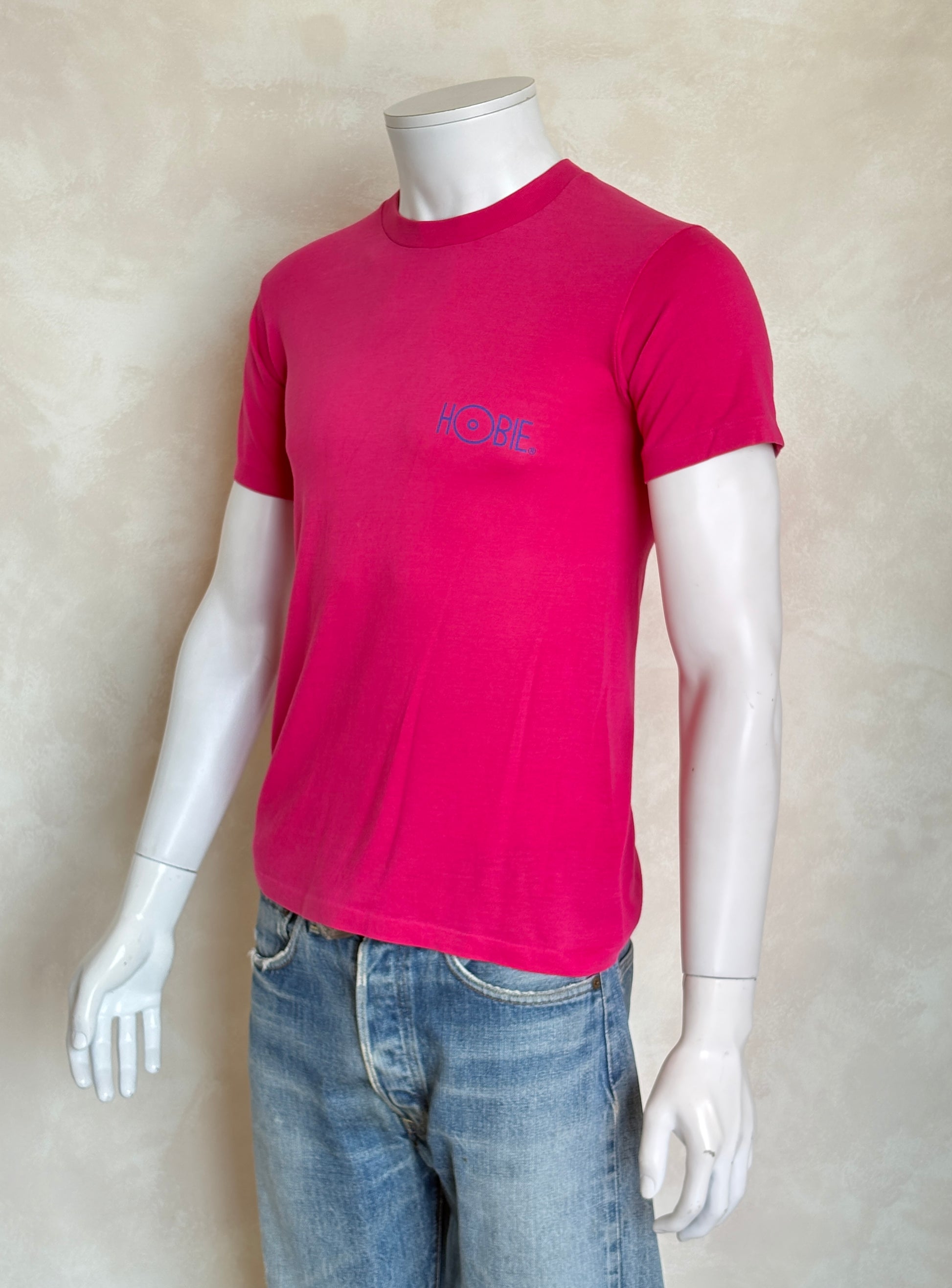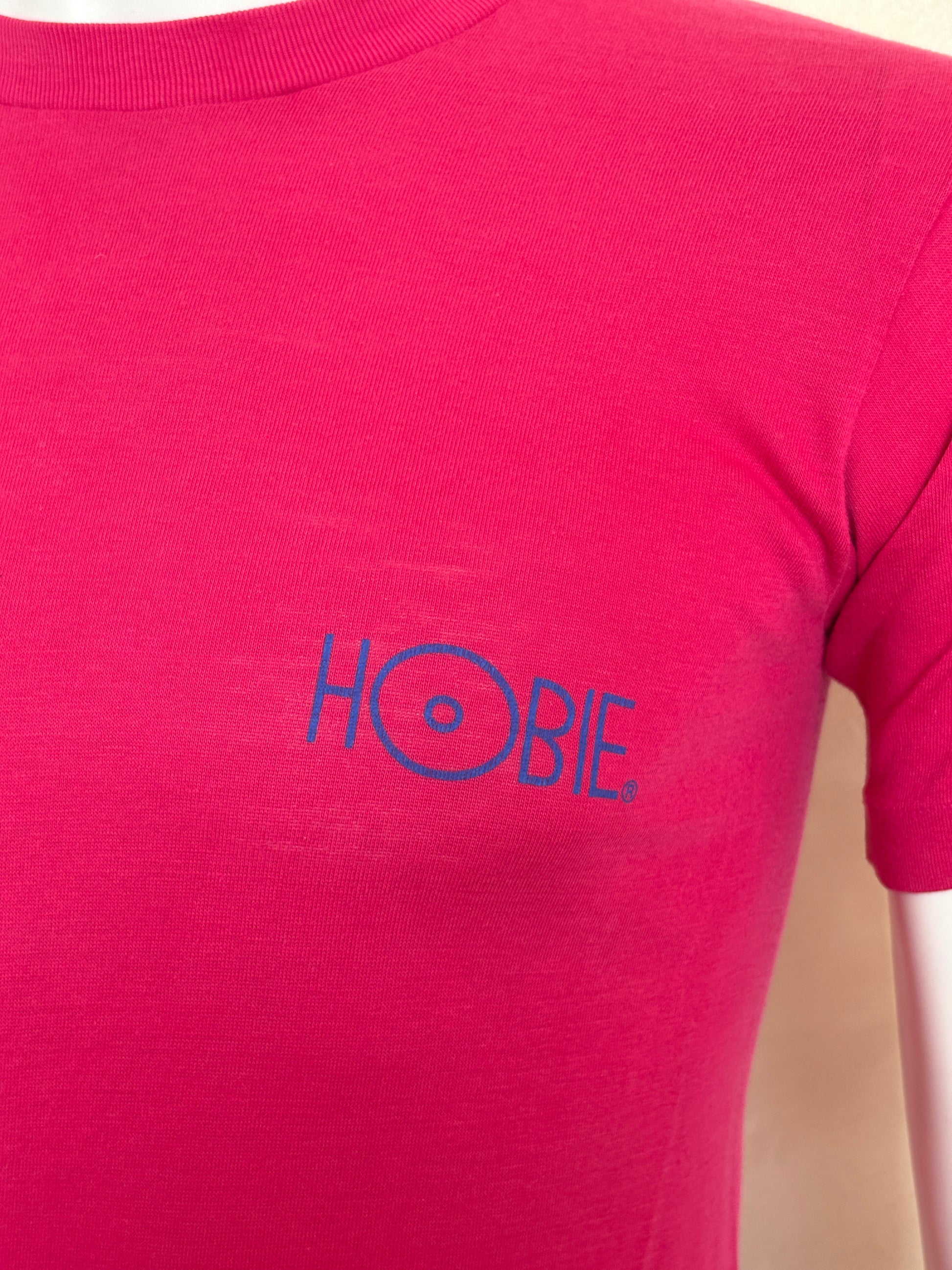 Vintage 80s Hobie Surf T-Shirt — Bright Pink Single Stitch Tee with Colorful Graphic Back Print — Small