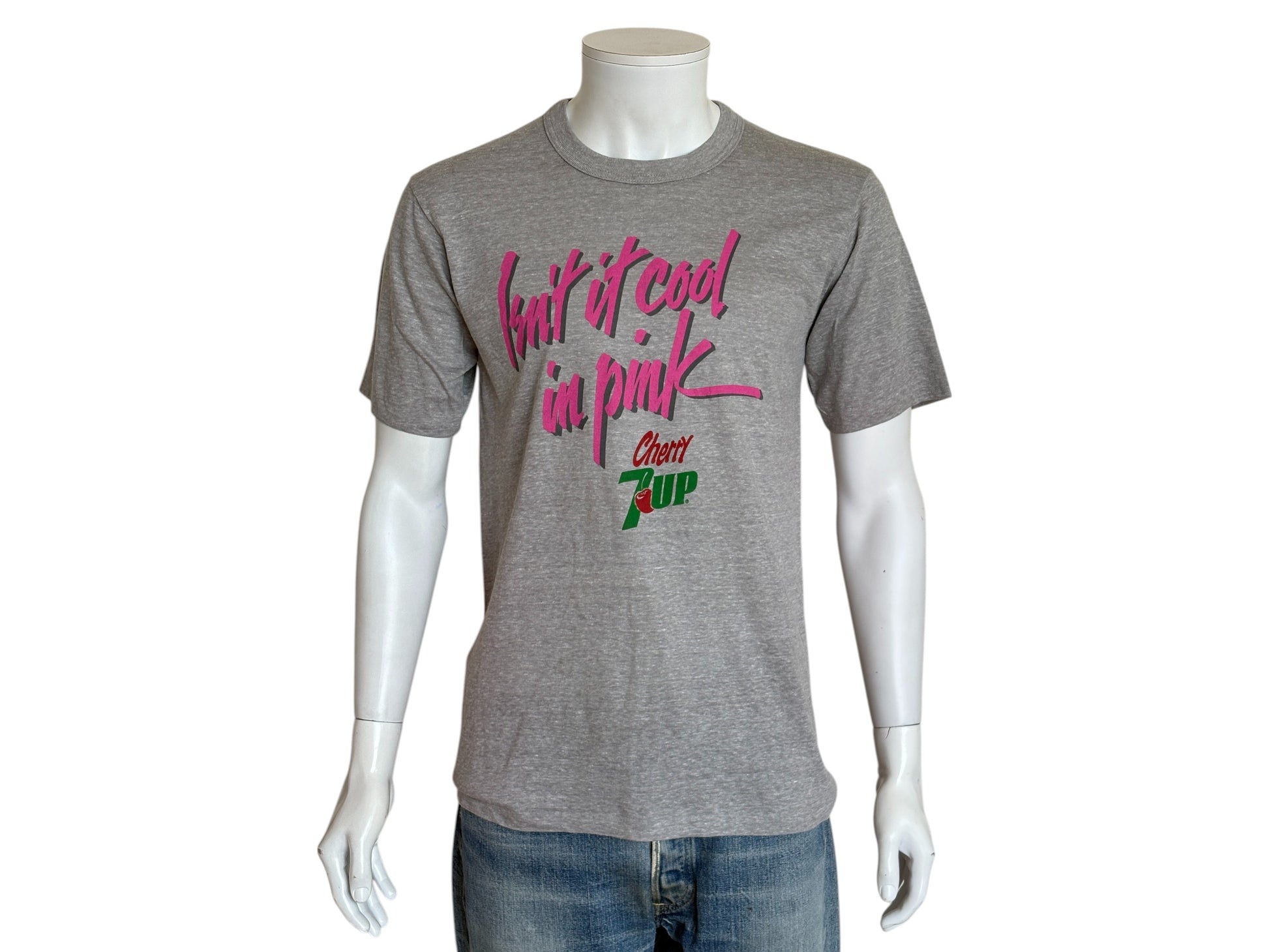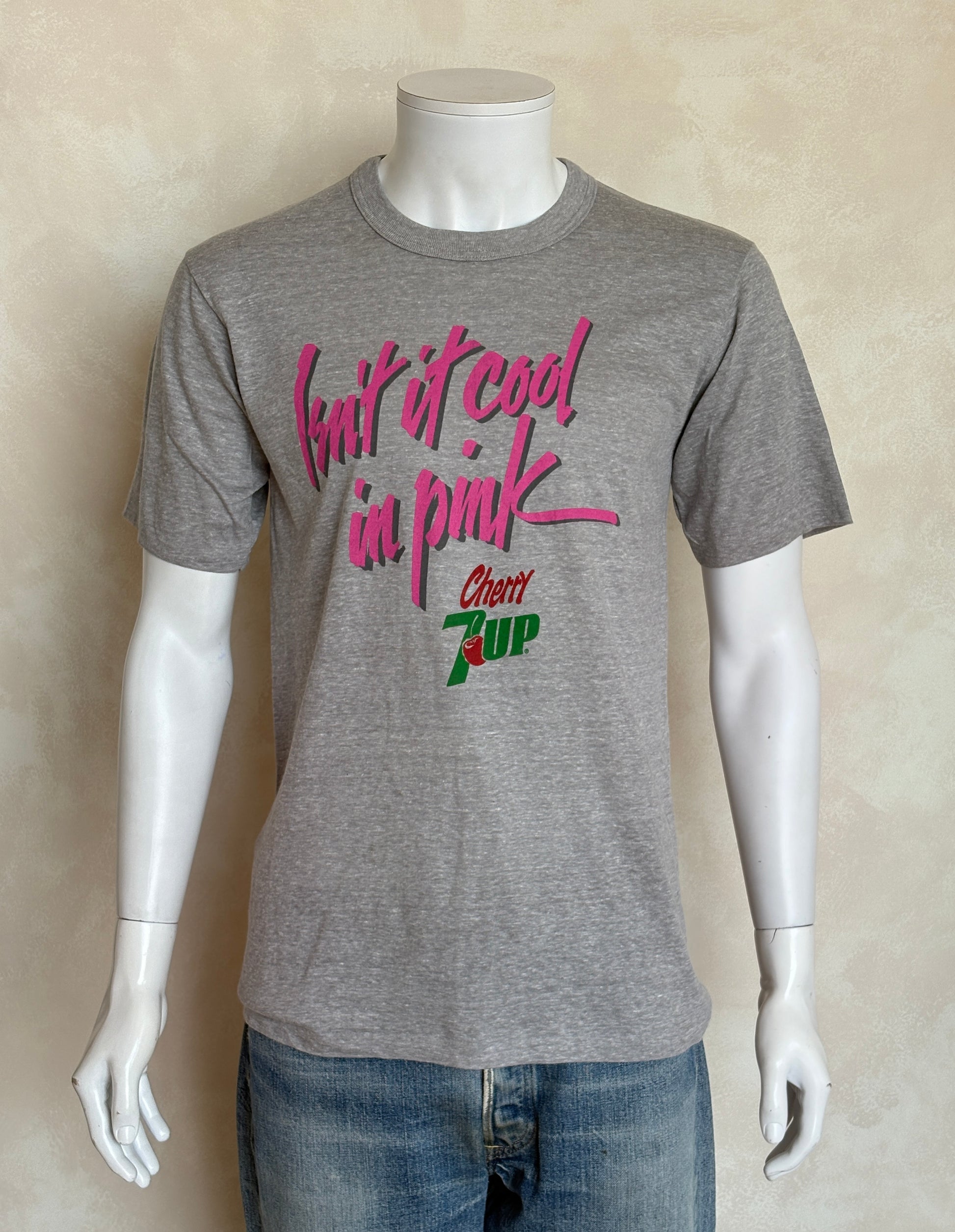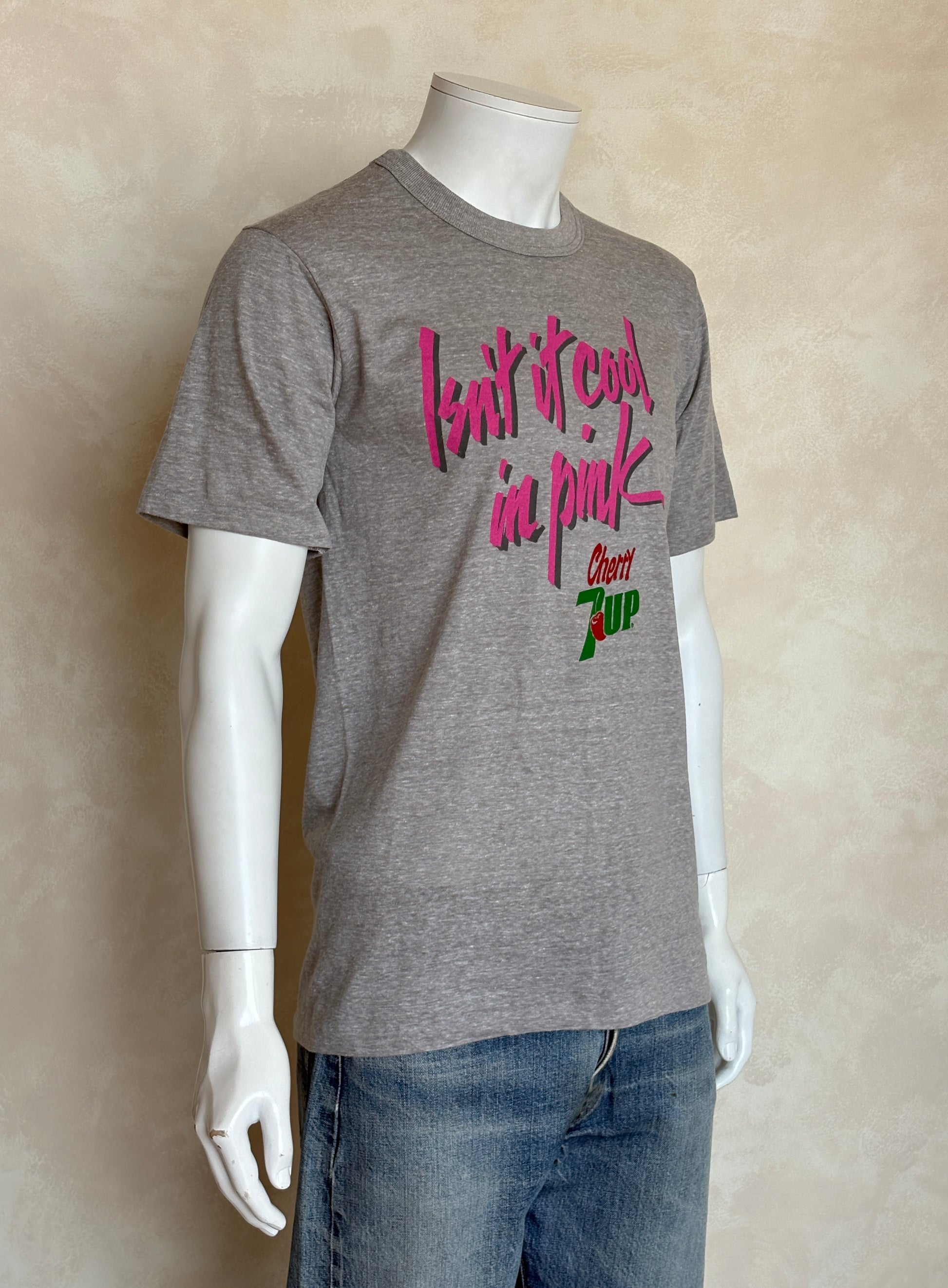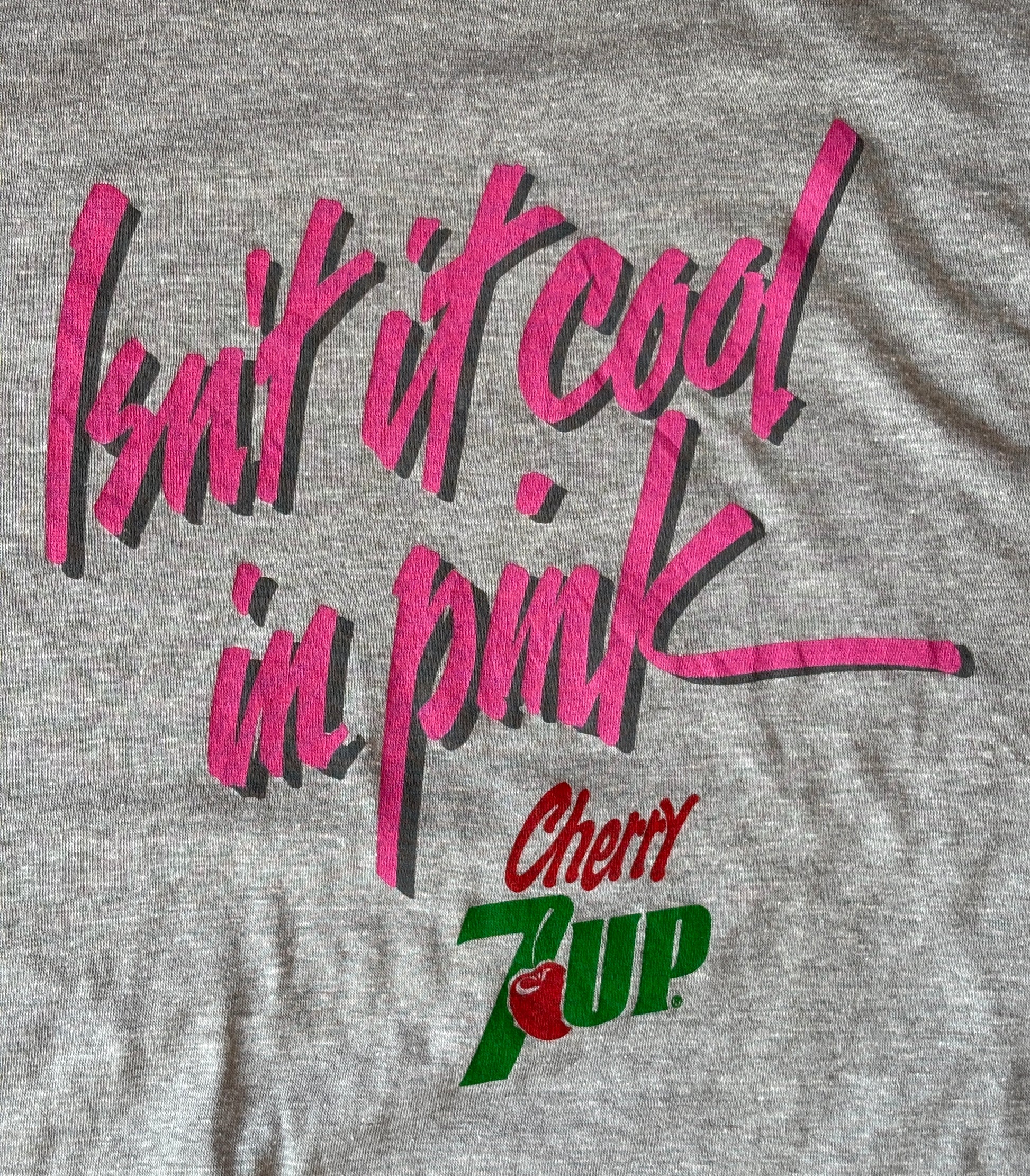 Description: Vintage Cherry 7UP T-Shirt 80s “Isn’t It Cool in Pink” Soda Graphic Tee. Soft Drink Promo