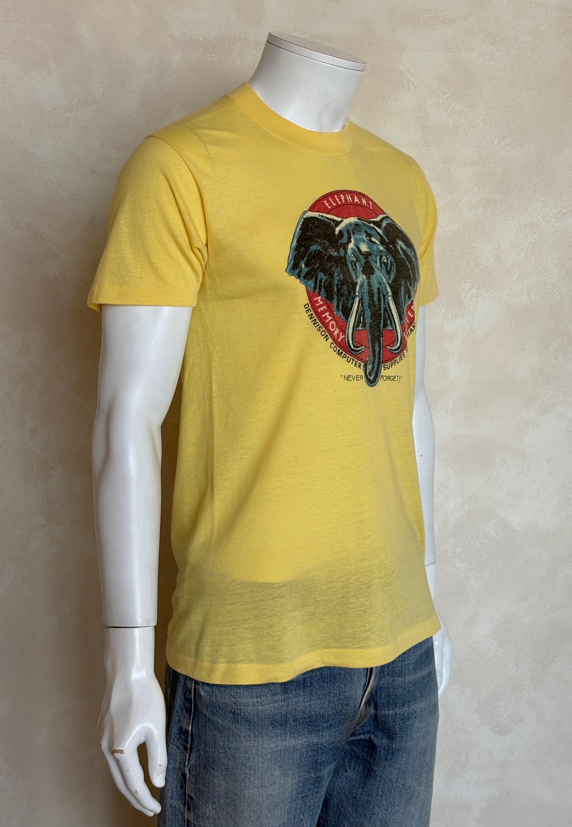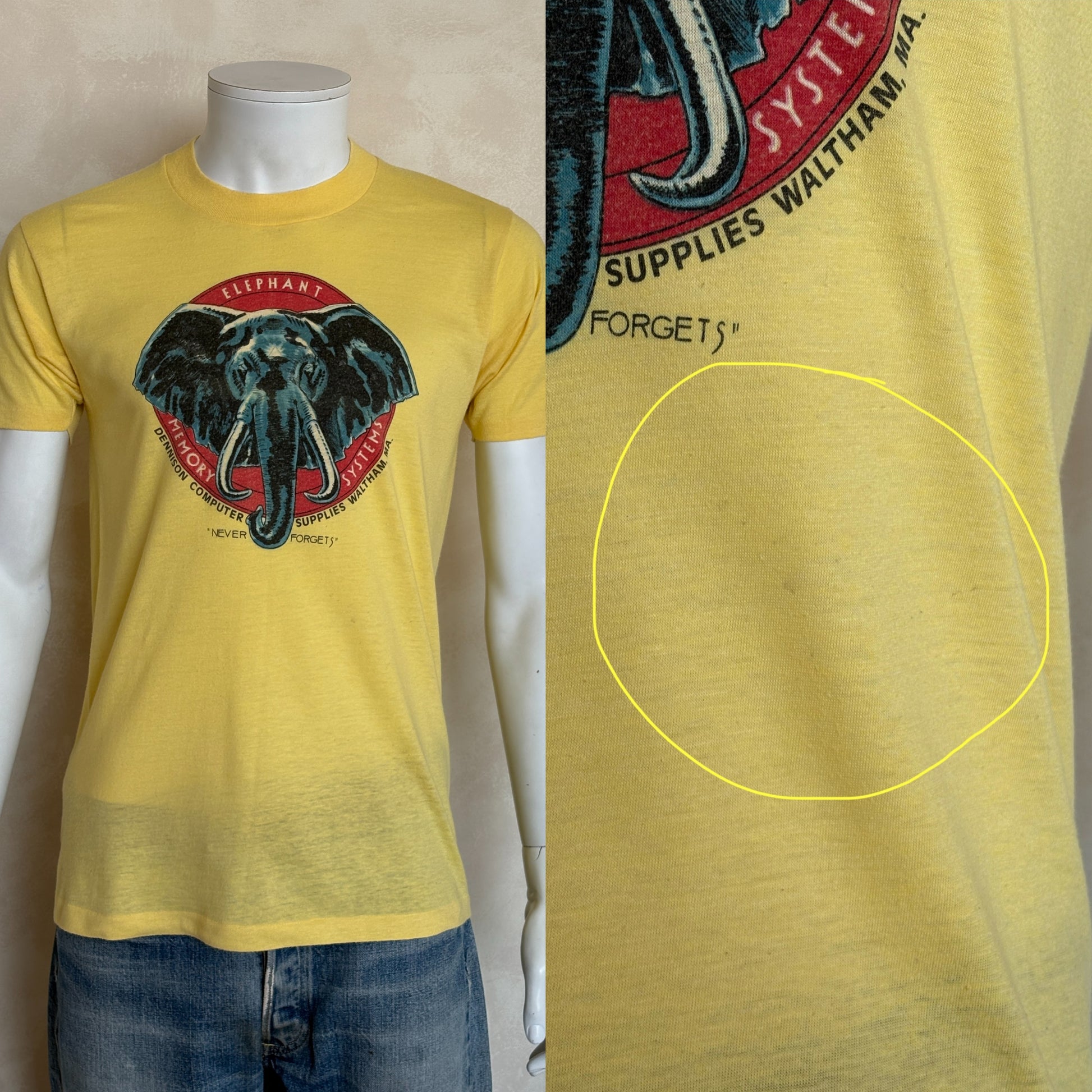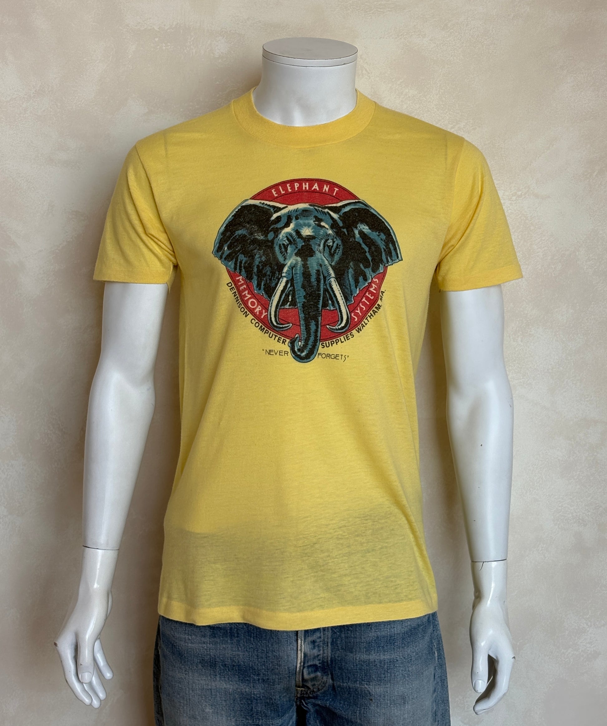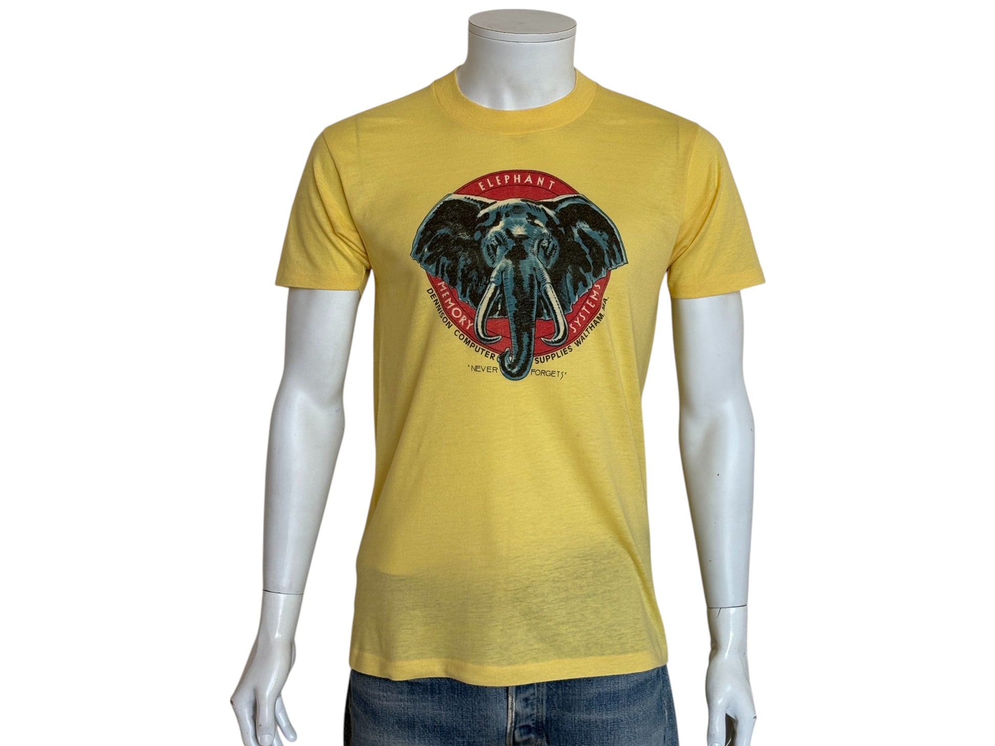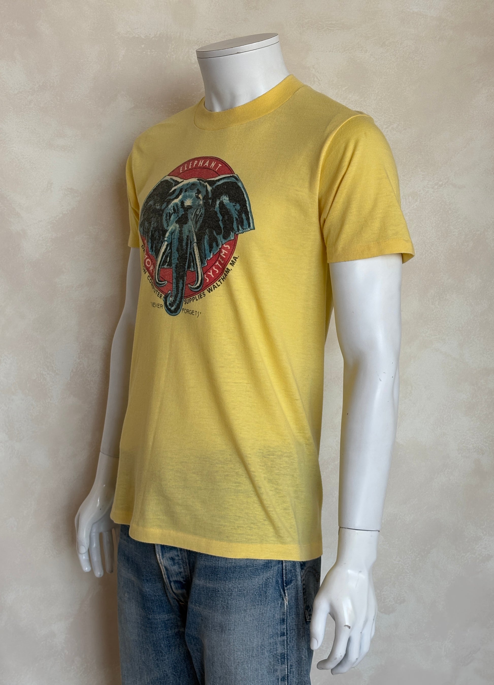 Description: Vintage Elephant Memory Systems tee – rare 80s computer supply promo with classic nerd humor.