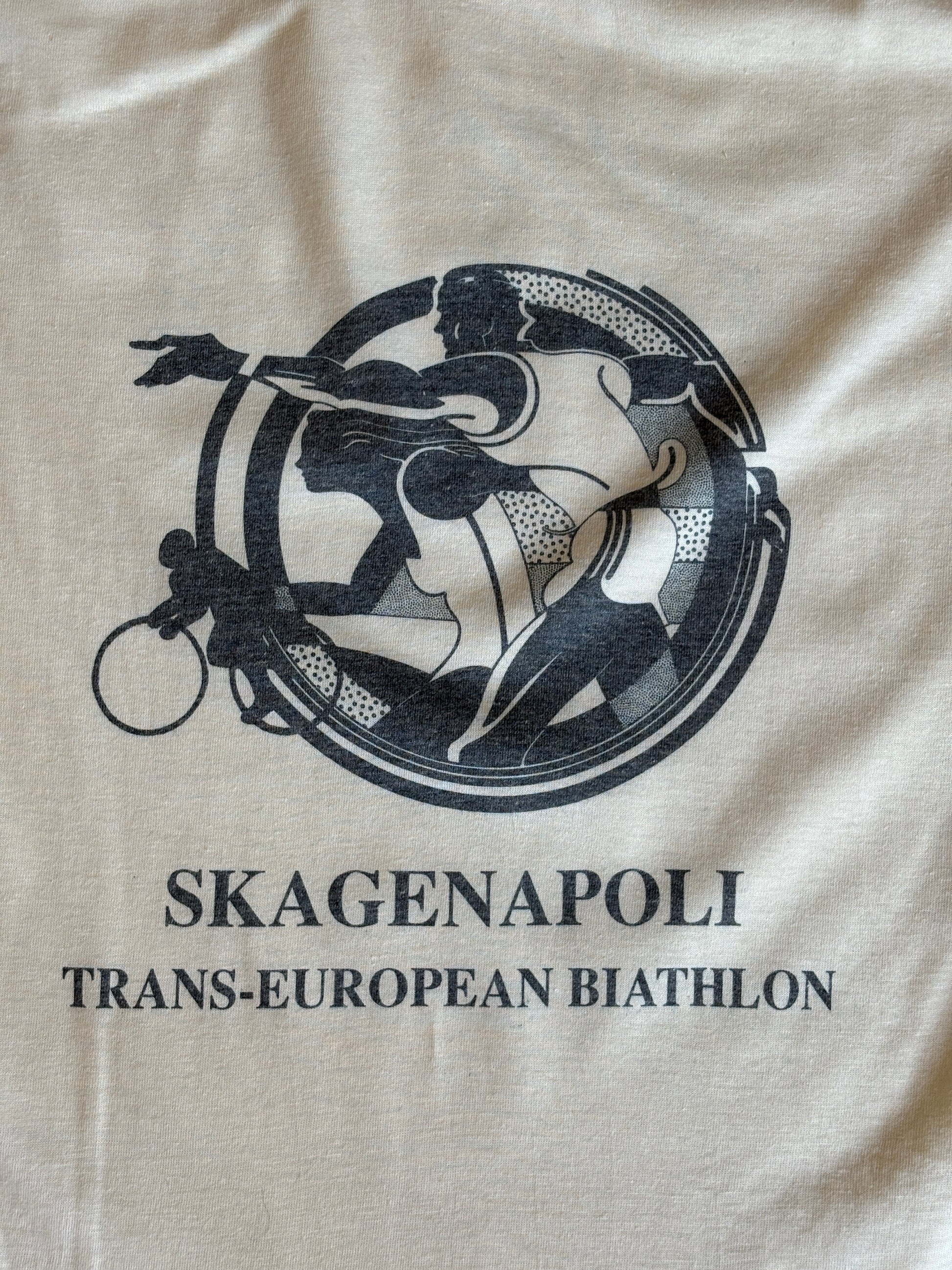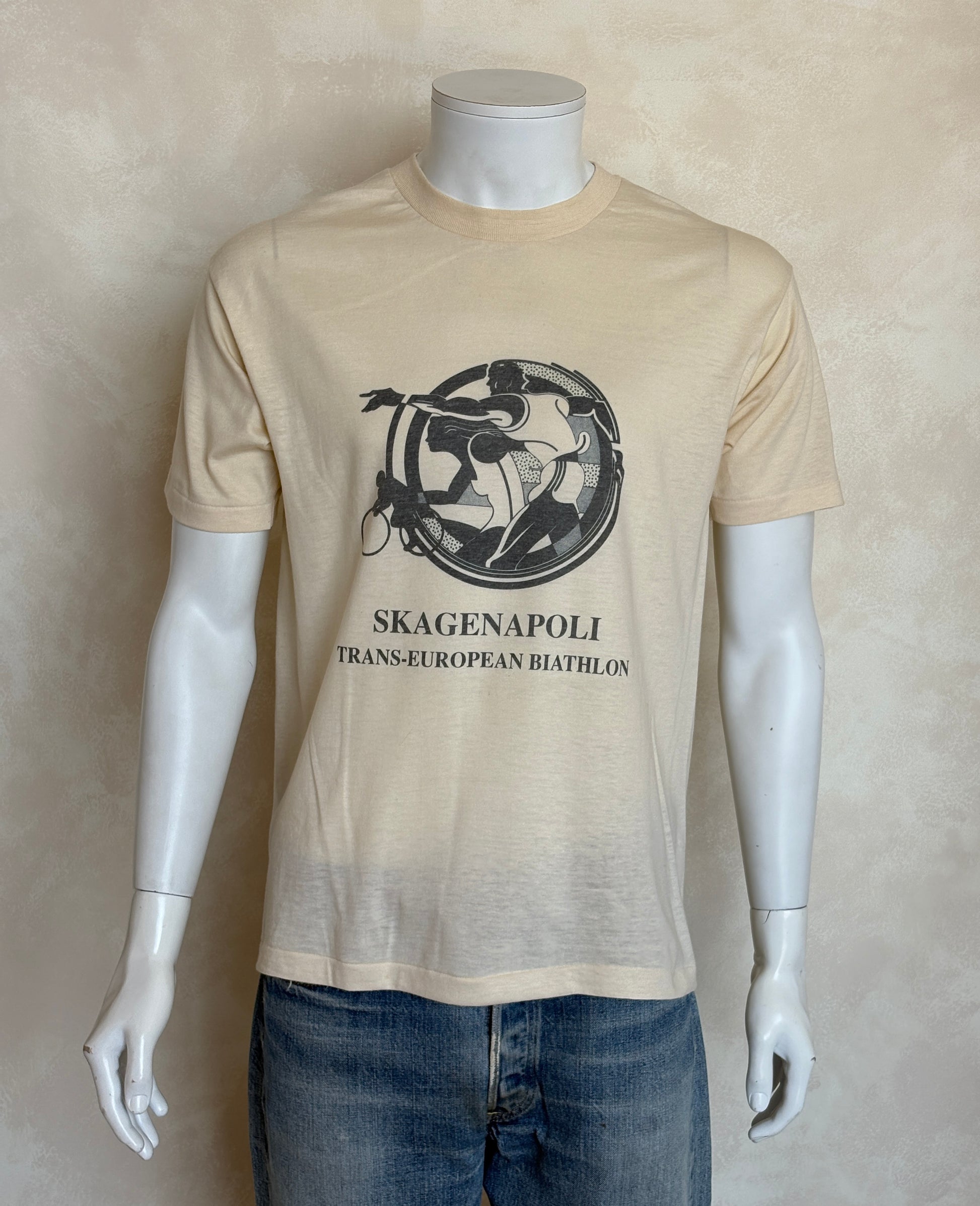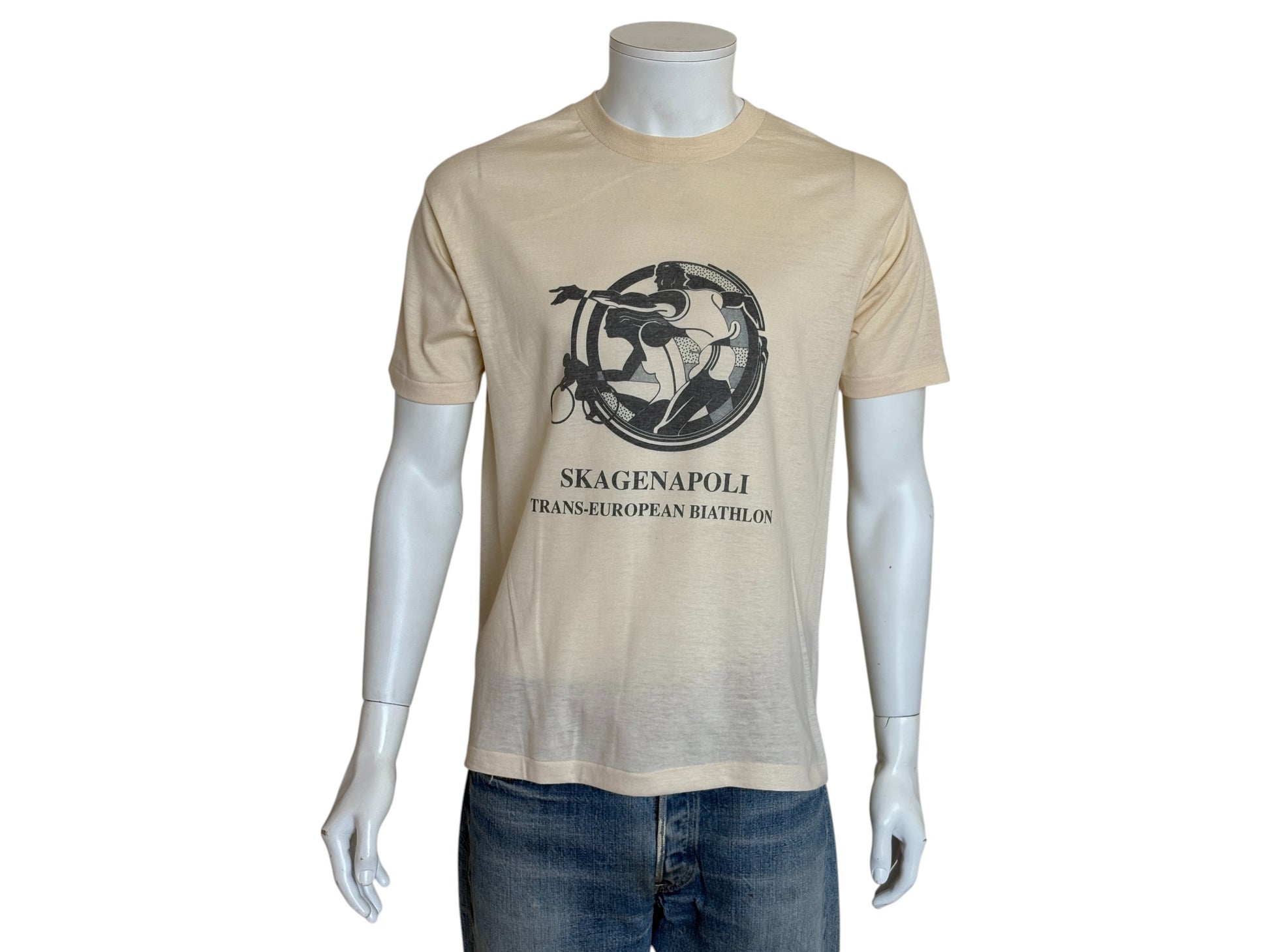 Vintage 1990 Skagenapoli Trans-European Biathlon T-Shirt – Denmark to Italy Route Map Tee. Large