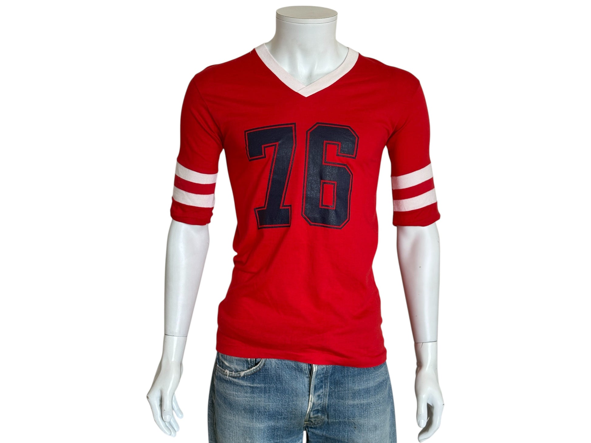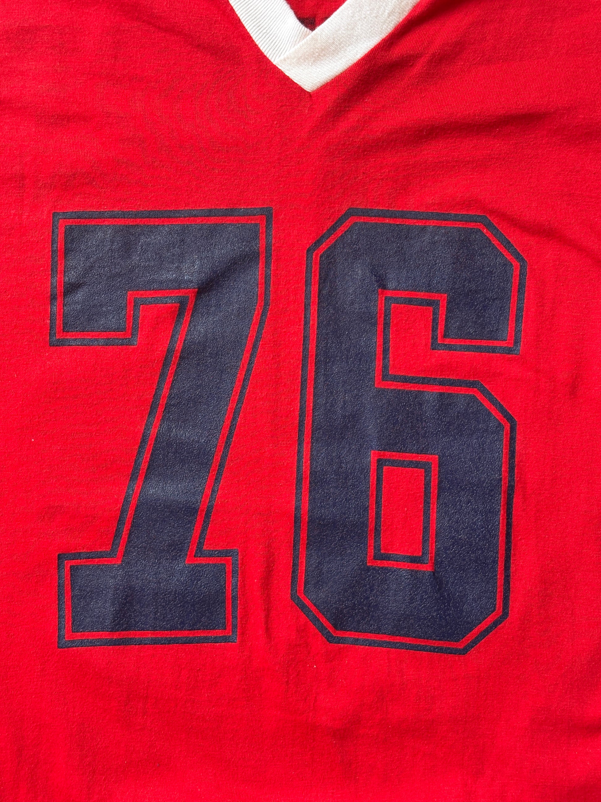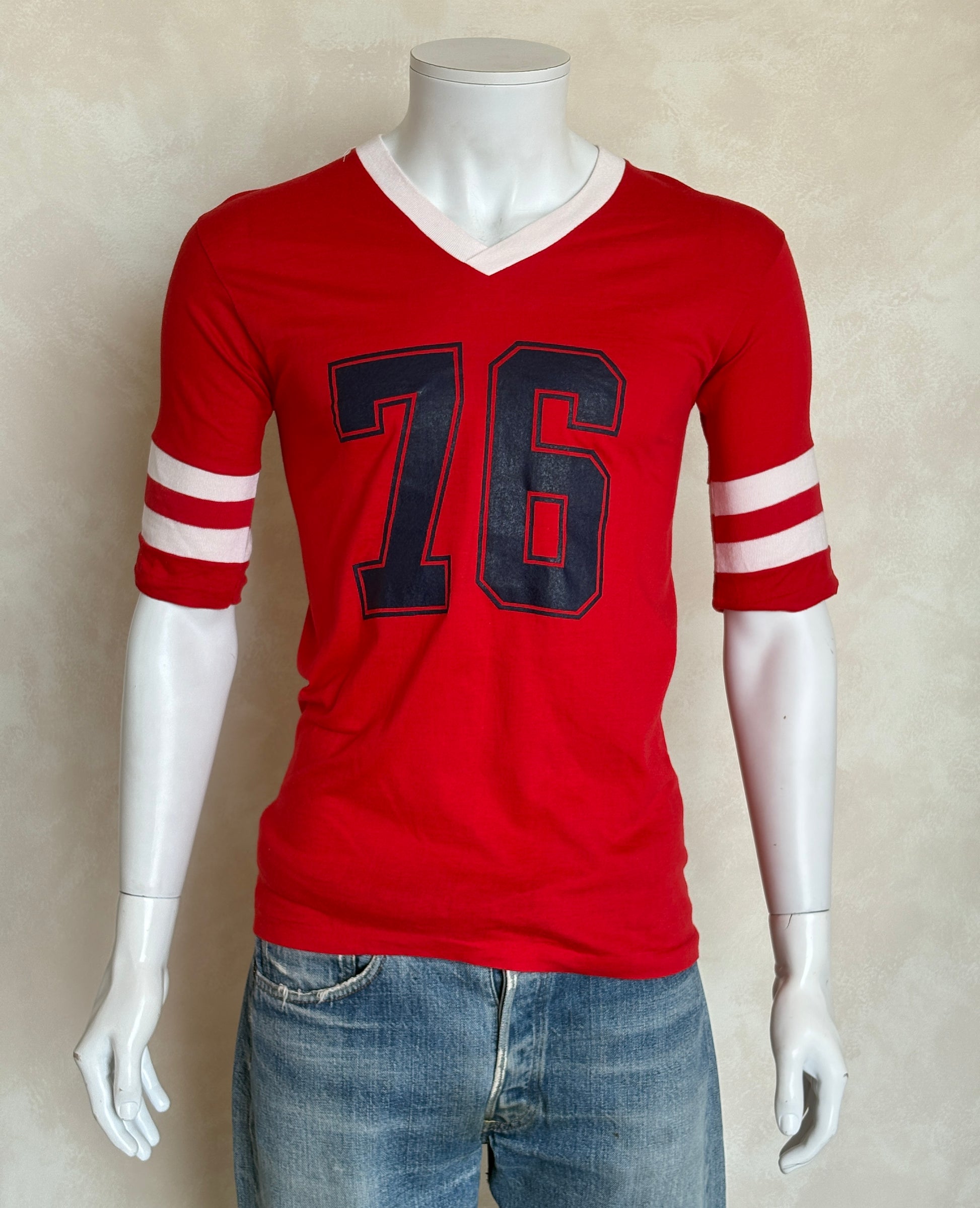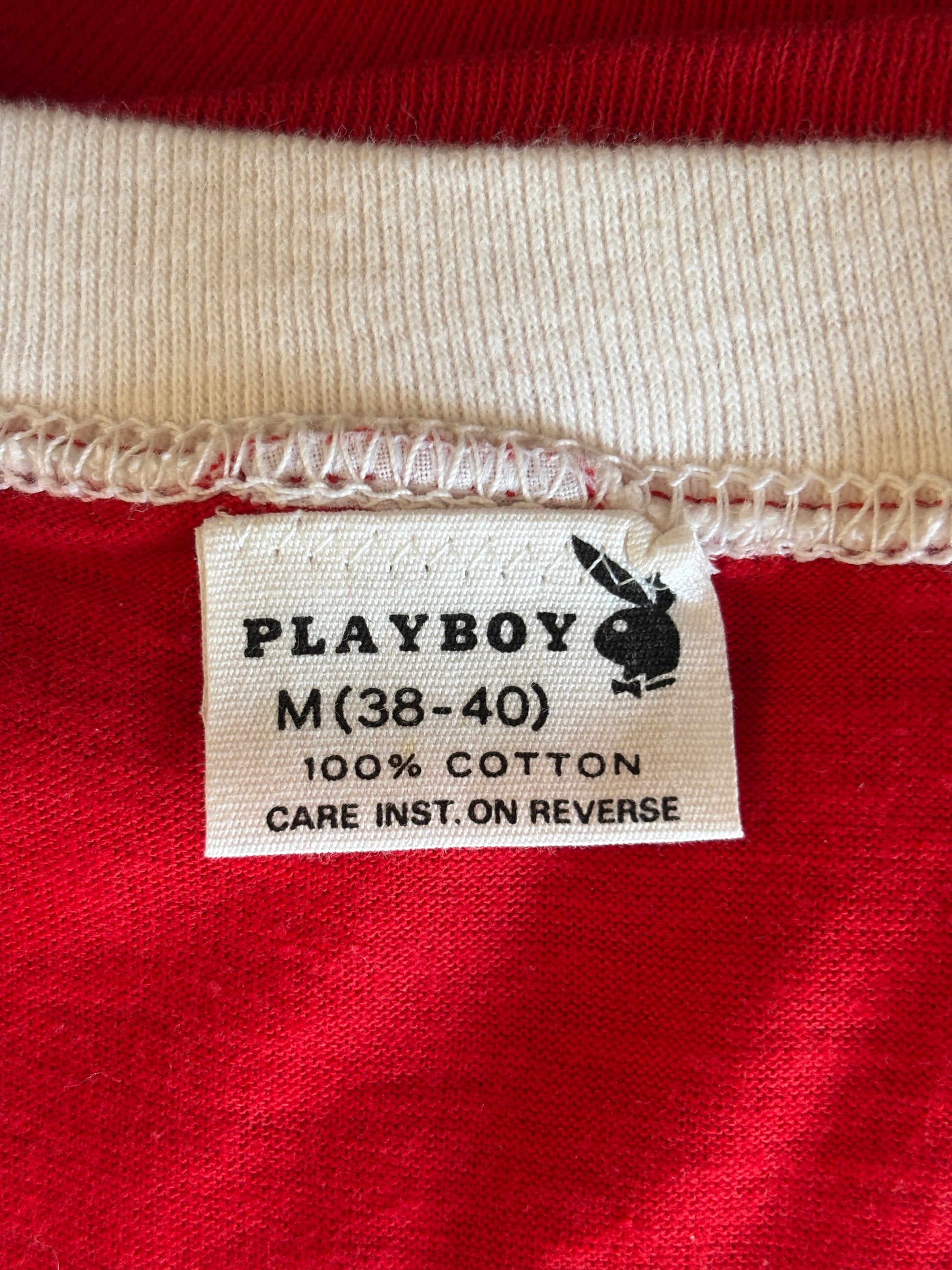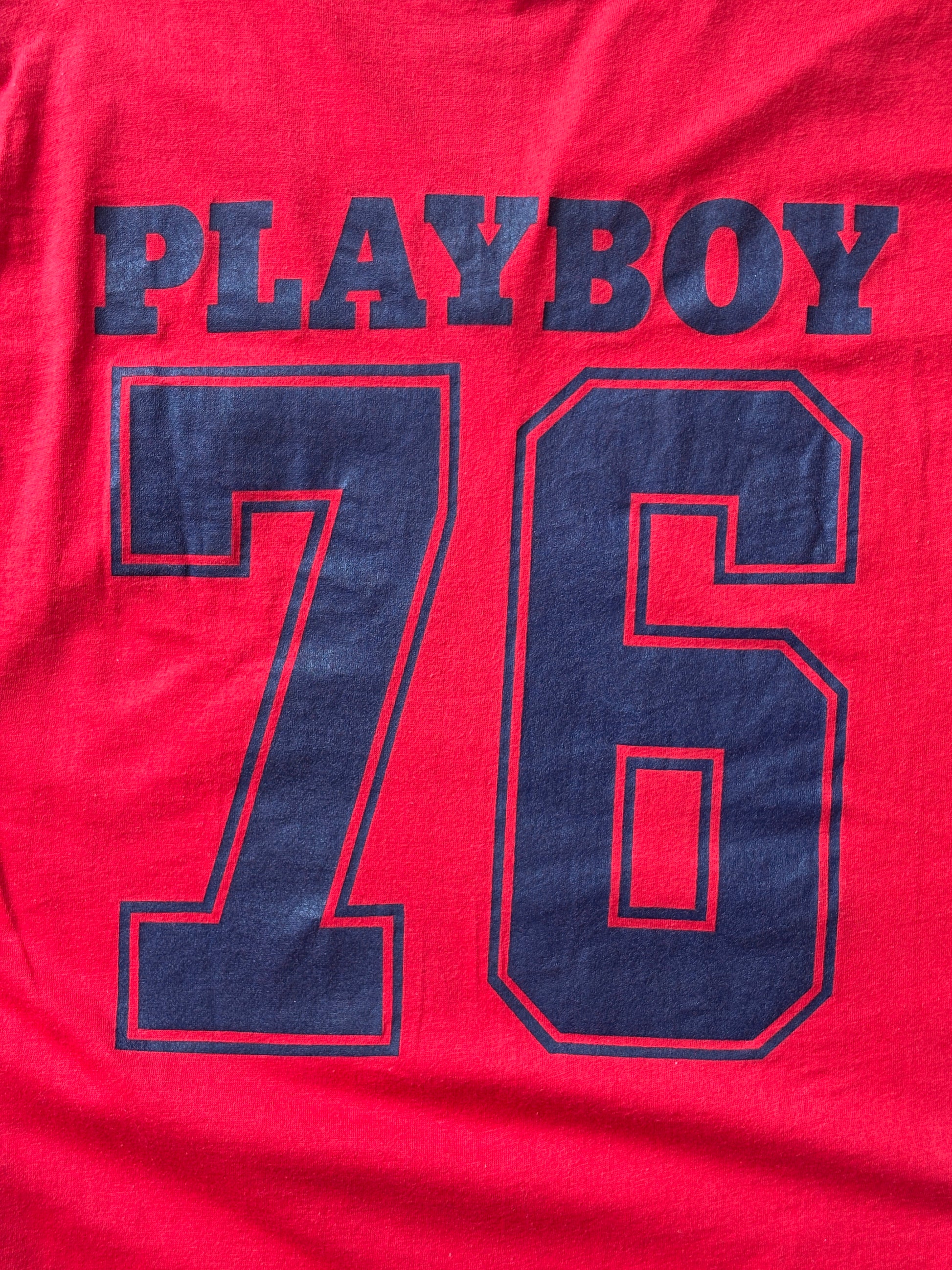 Description: Vintage Playboy 76 Jersey T-Shirt Red 70s Style Football Tee –