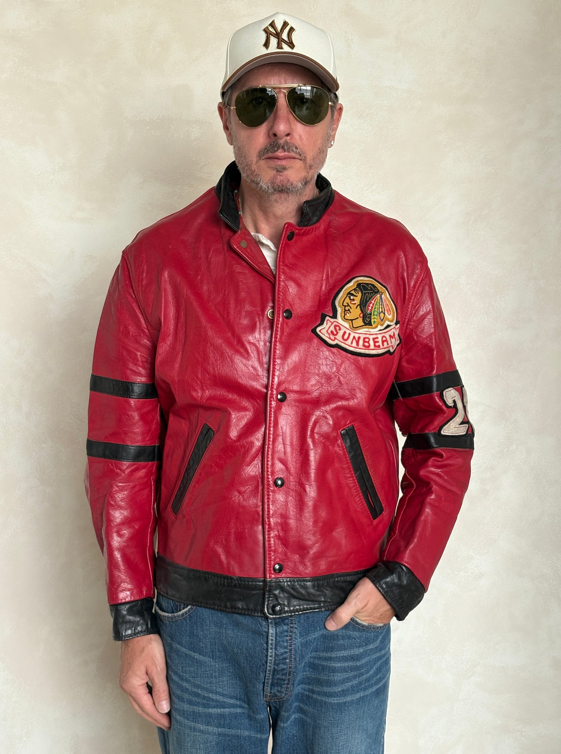 Crafted from genuine red and black leather, this vintage jacket features a bold chenille Sunbeam team patch on the chest and a #27 on the sleeve. The design, inspired by classic varsity and hockey aesthetics, captures the energy and pride of mid-century Canadian athletics.