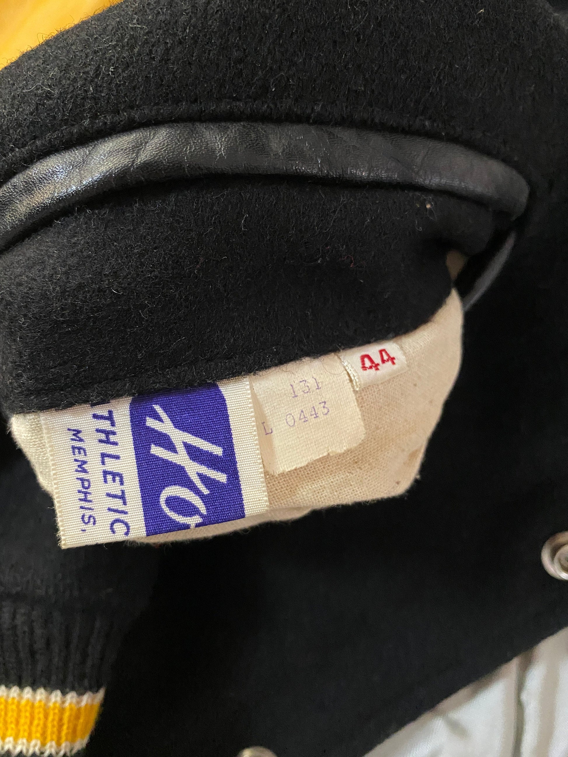 Description: Superb 1971 Varsity jacket, made of woolbody and leather sleeves, made in the USA by Athletic apparel.