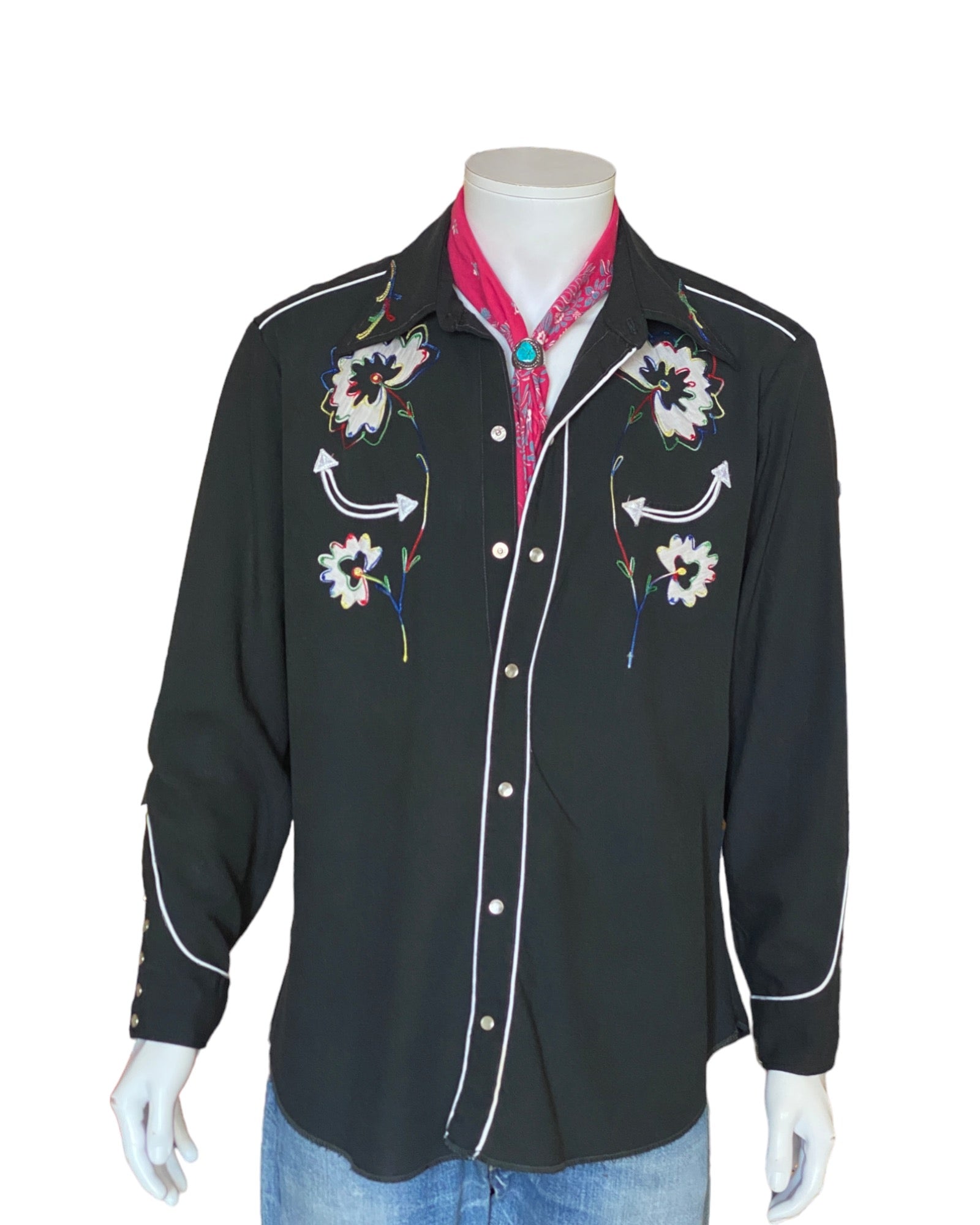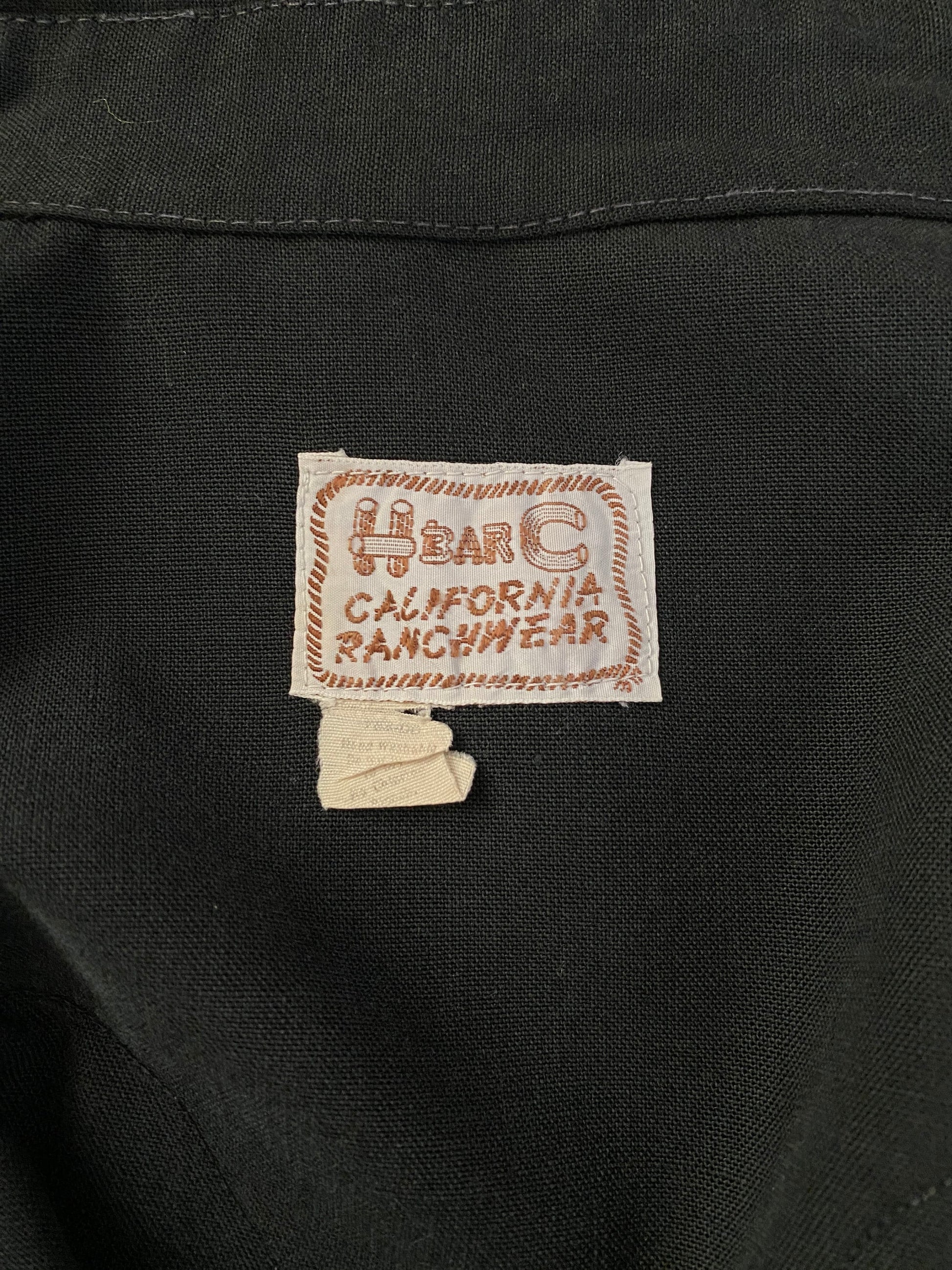 Description: Superb 70s Vintage embroidered western cotton polyester shirt made by H bar C Ranchwear, Made in USA.