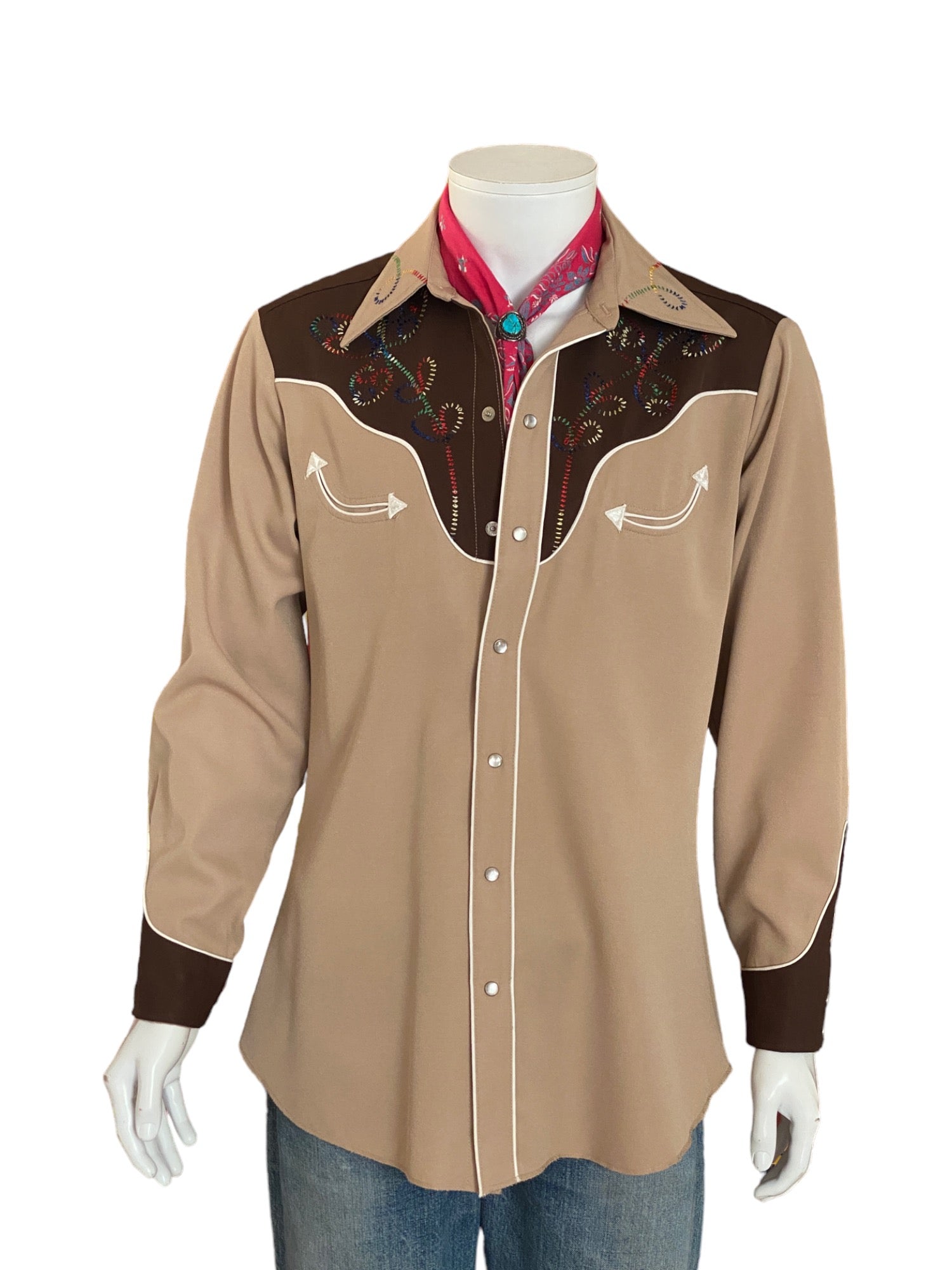 Description: Superb 70s Vintage embroidered western polyester shirt made by H bar C Ranchwear, Made in USA.