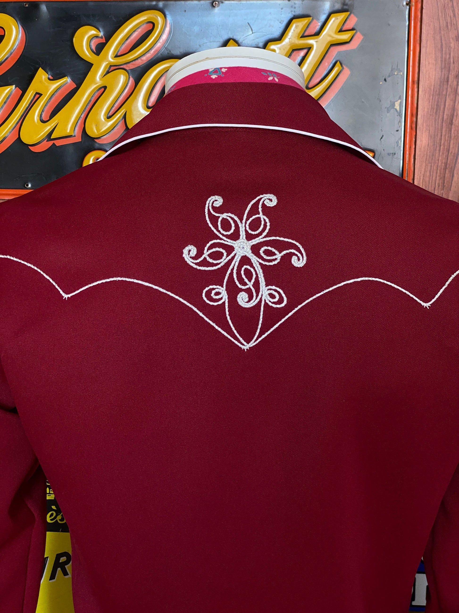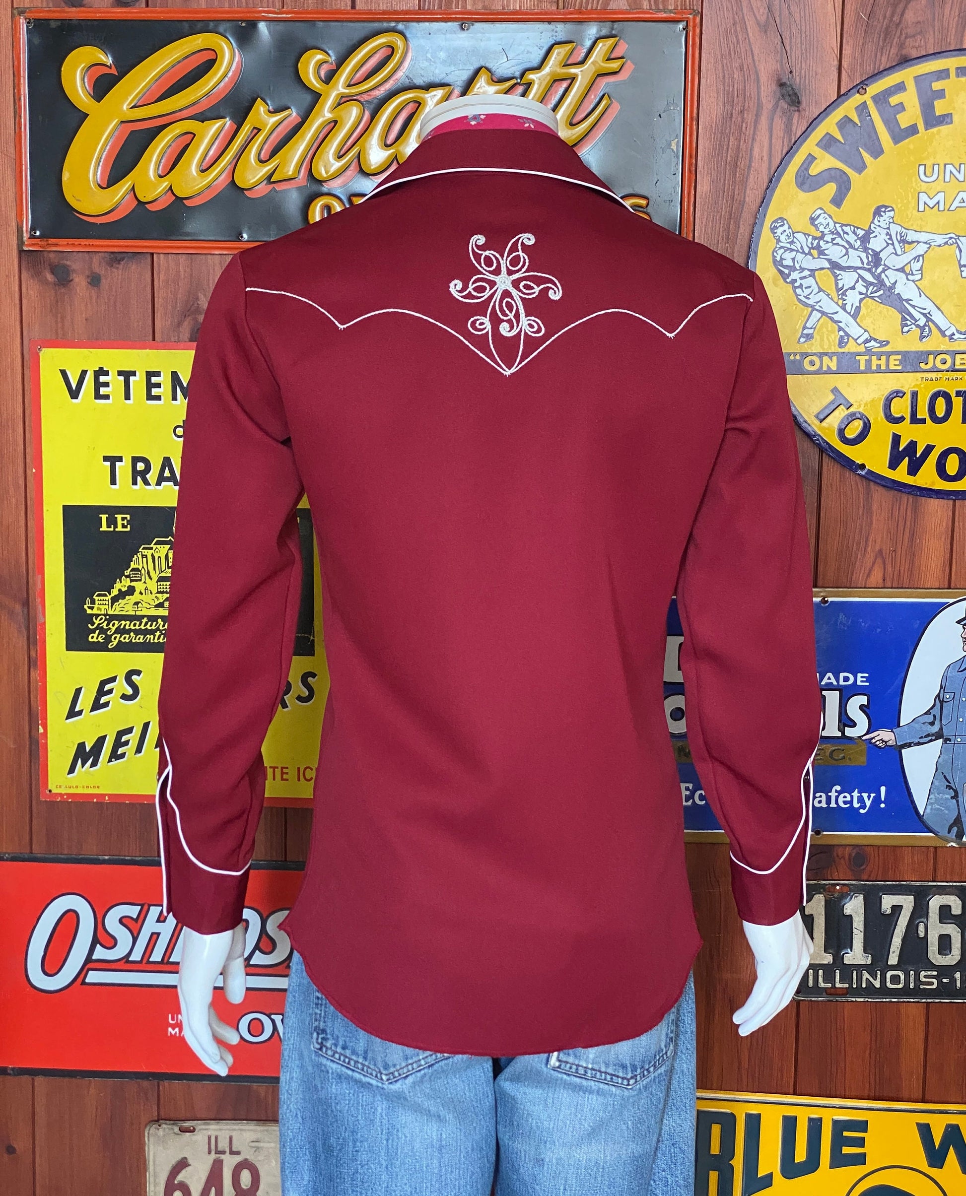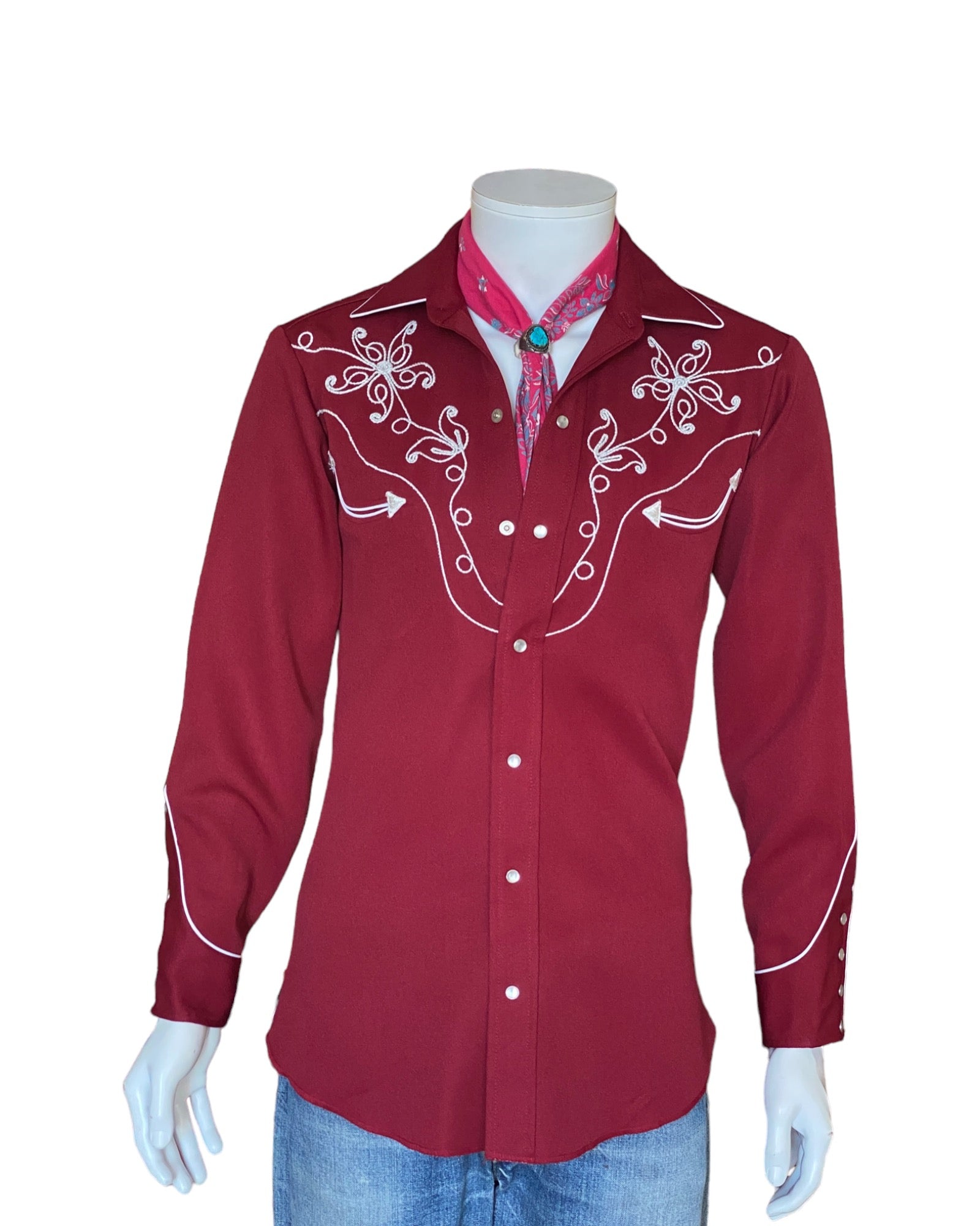 Description: Superb 70s Vintage embroidered western polyester shirt made by H bar C Ranchwear, Made in USA.