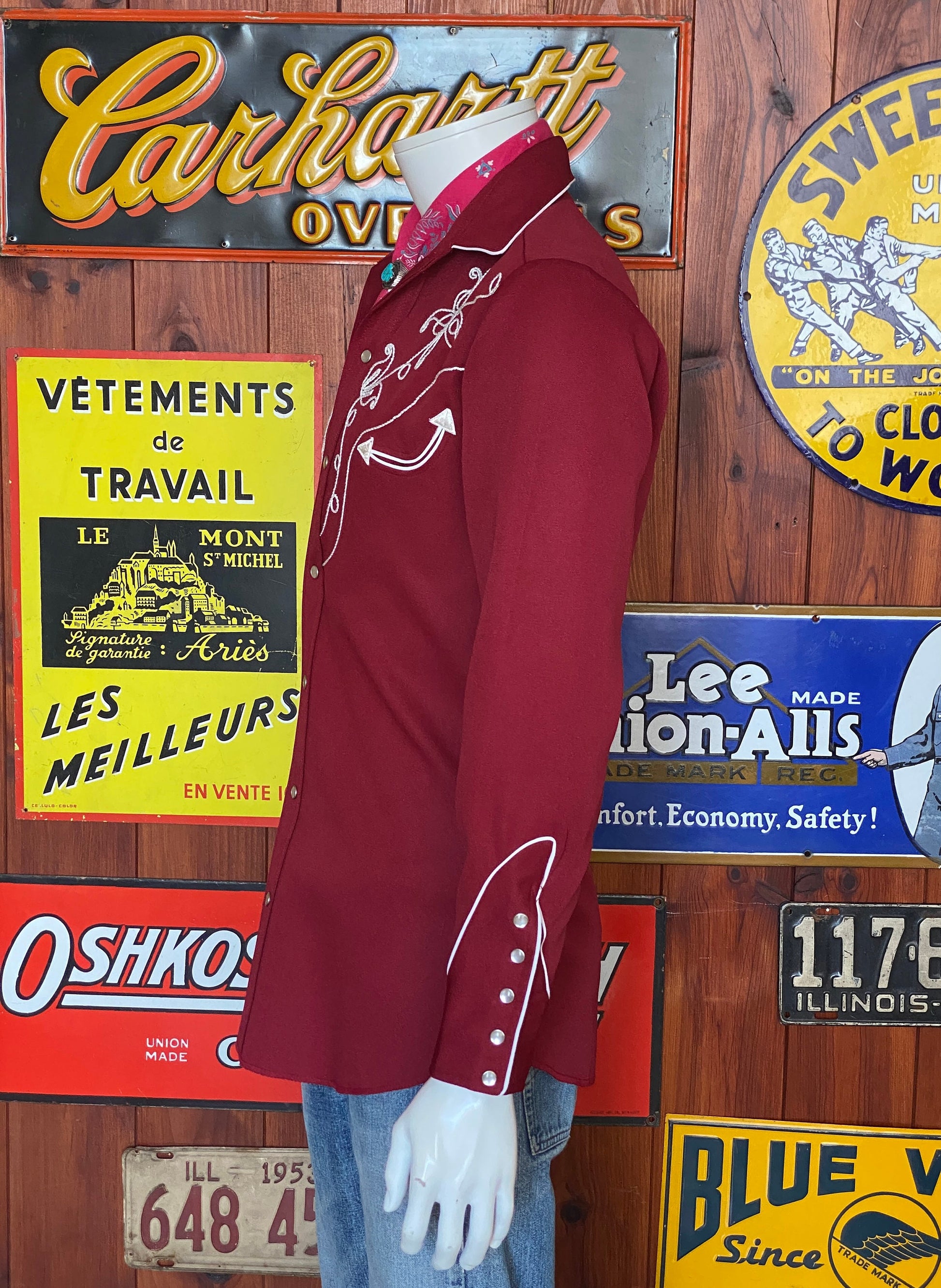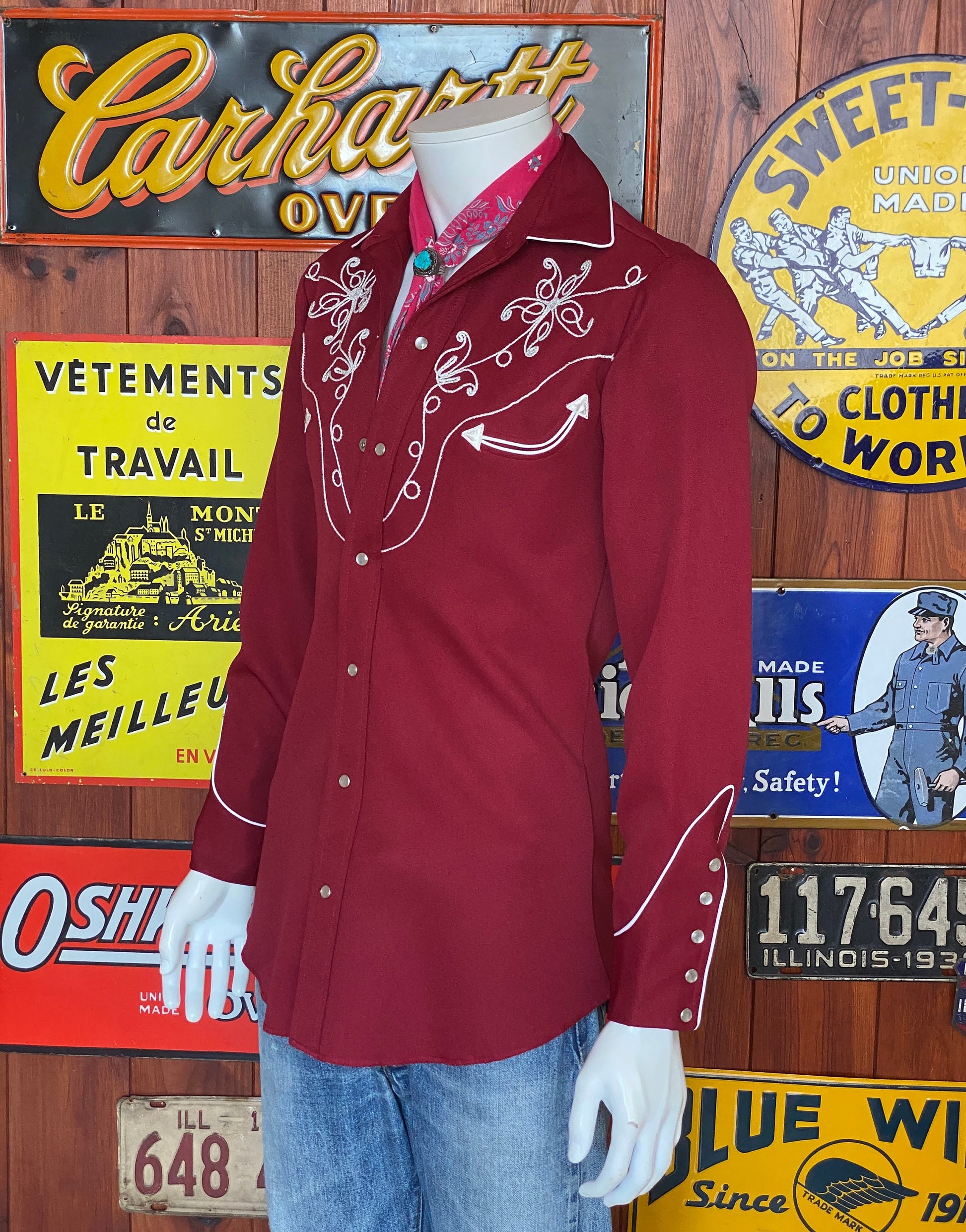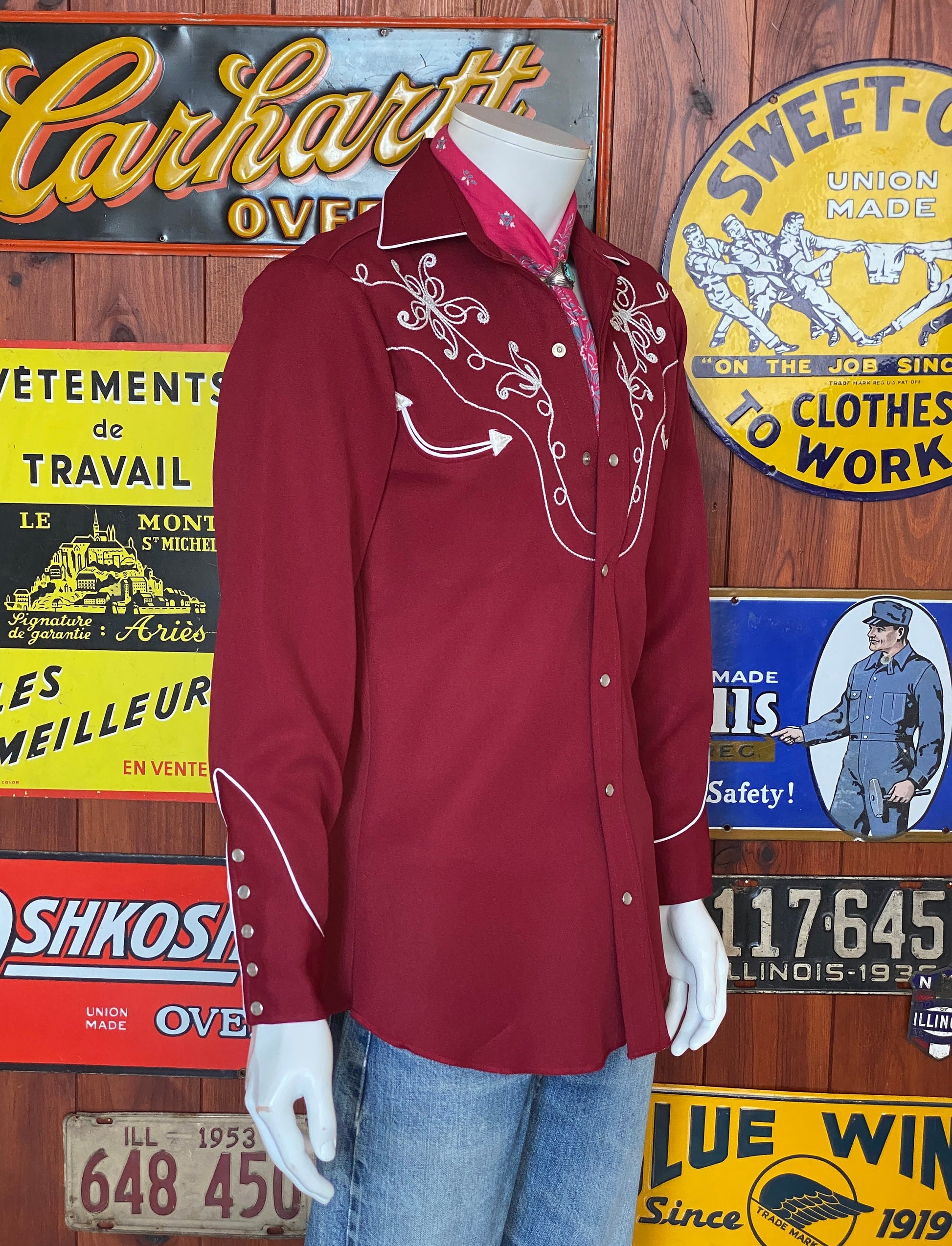 Description: Superb 70s Vintage embroidered western polyester shirt made by H bar C Ranchwear, Made in USA.