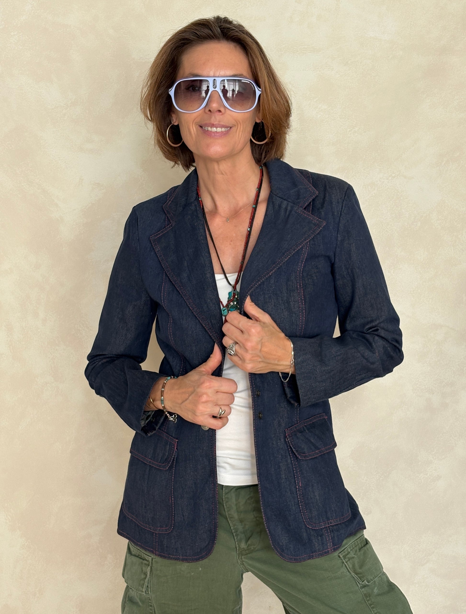 Authentic 1970s denim blazer by Patty Woodard, handcrafted in California. This piece captures the effortless West Coast style of the era — tailored yet relaxed, with beautiful structure and attention to detail.