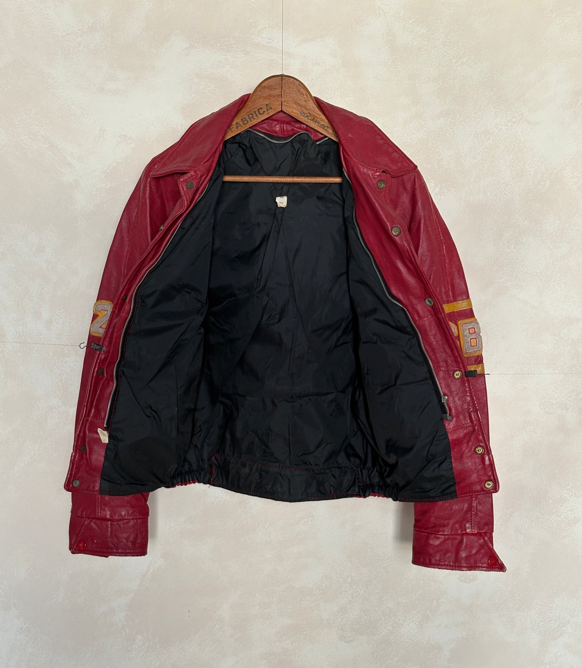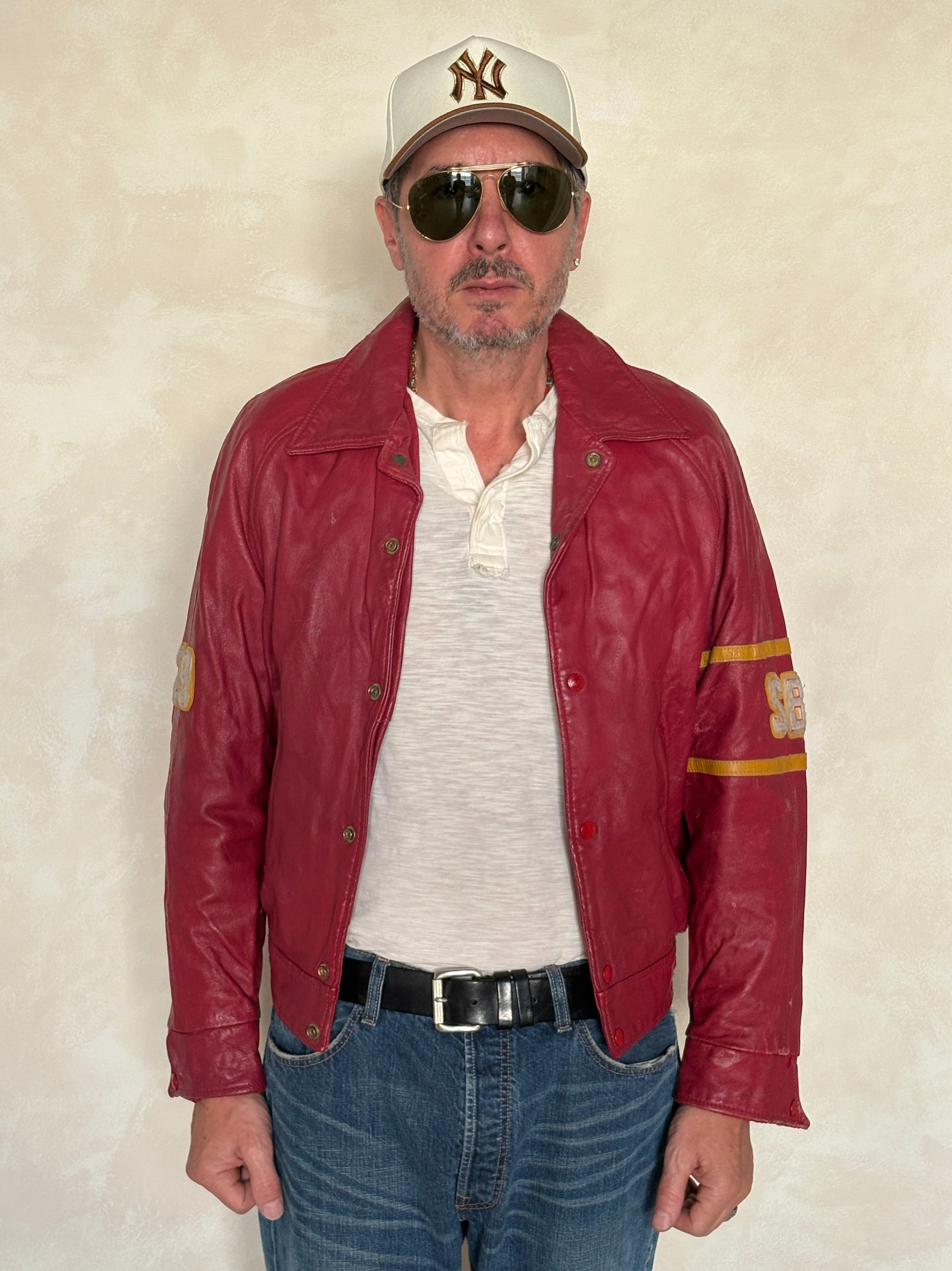Réalisée en cuir rouge profond, elle présente les patchs originaux SB et le numéro 29, typiques des vestes d’équipes sportives du St. Boniface College.