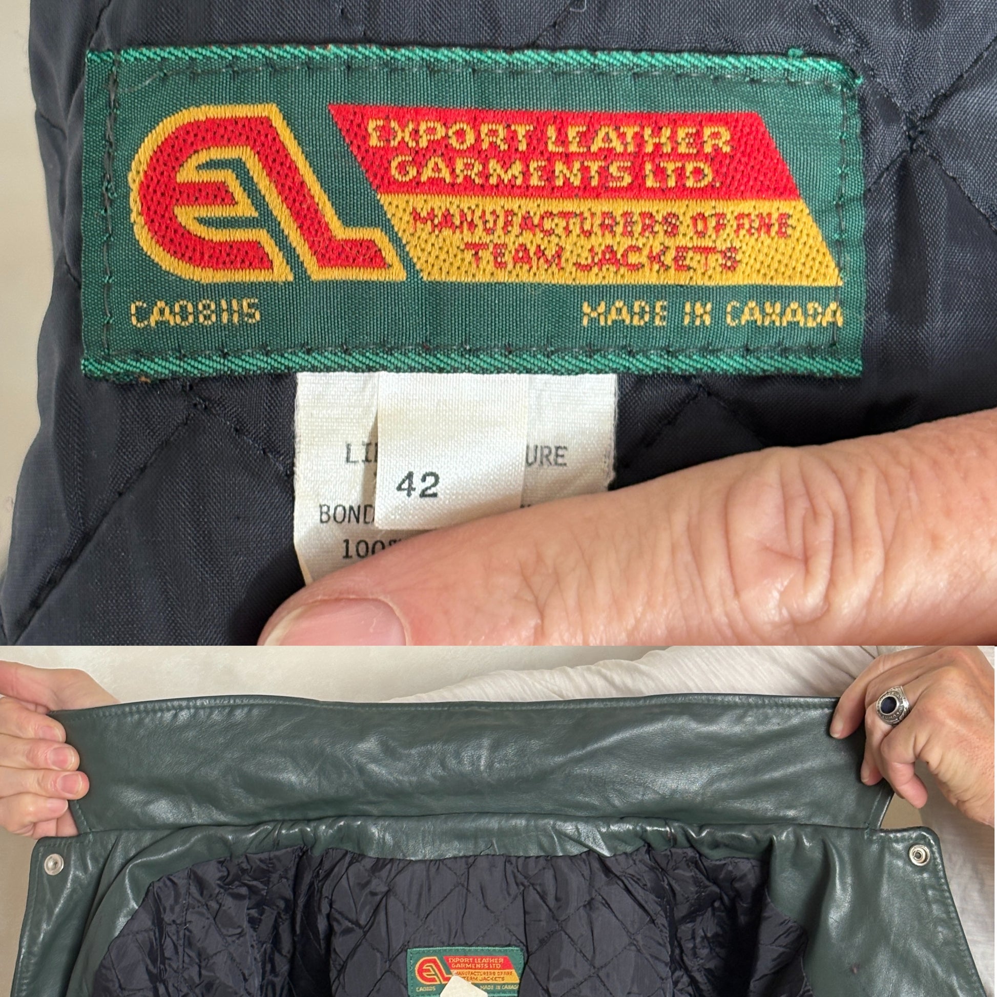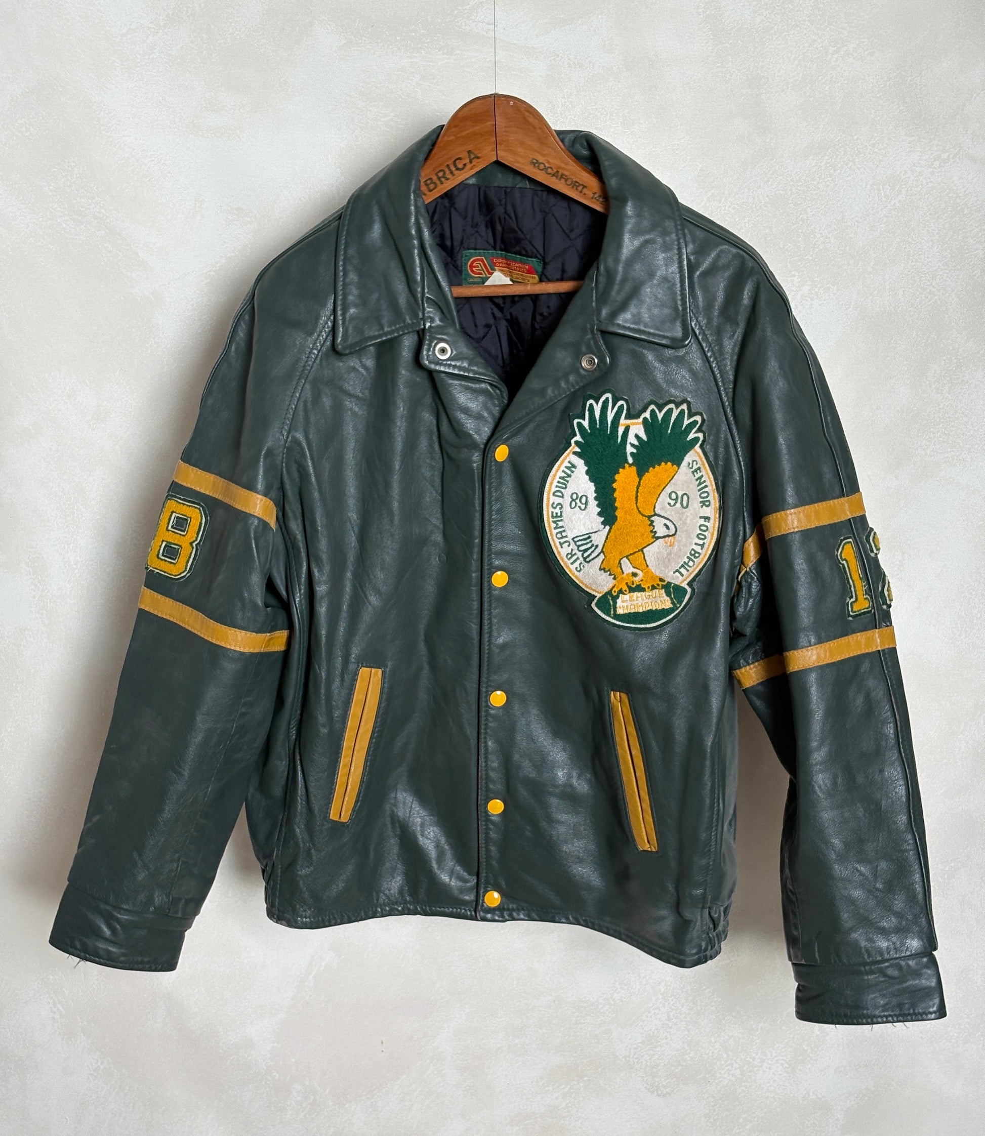 Authentic Canadian varsity leather jacket from the Sir James Dunn Eagles football team, celebrating their 1989–90 League Championship.