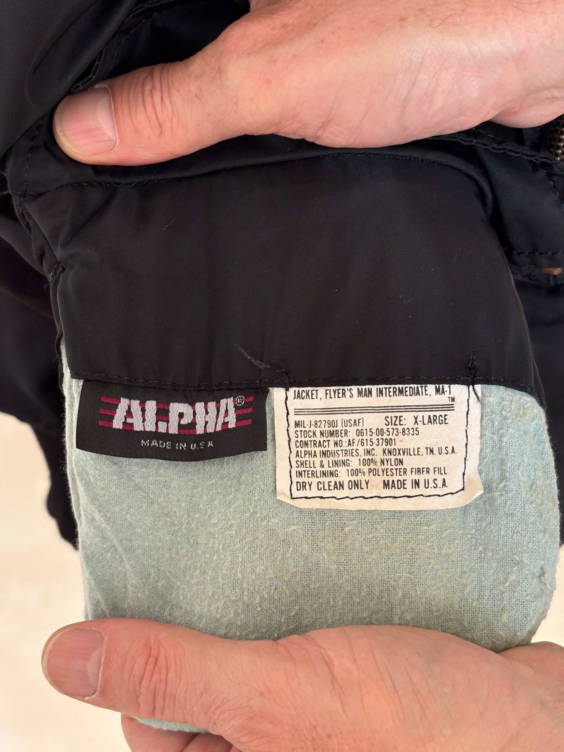 XL. vintage 90s Alpha Industries flying intermediate type MA-1 jacket, Made in USA