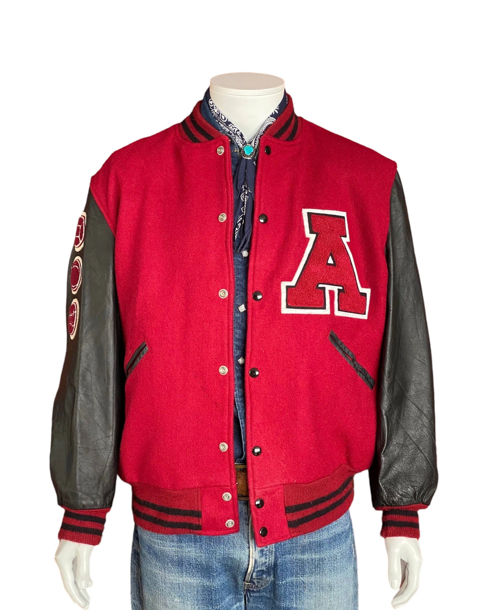 Description: Superb Varsity jacket, made of red wool body with black leather sleeves, made in the USA by Butwin.