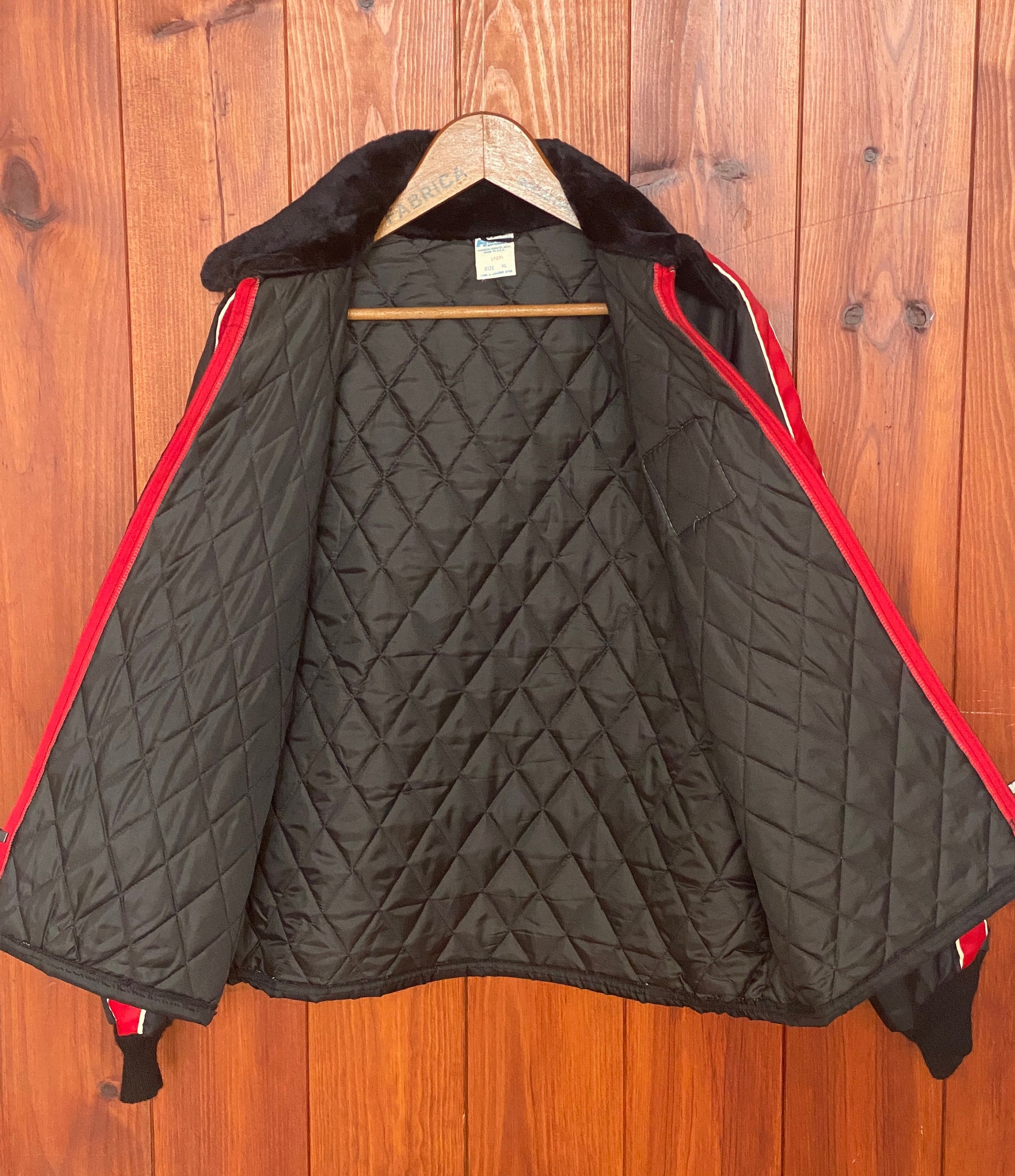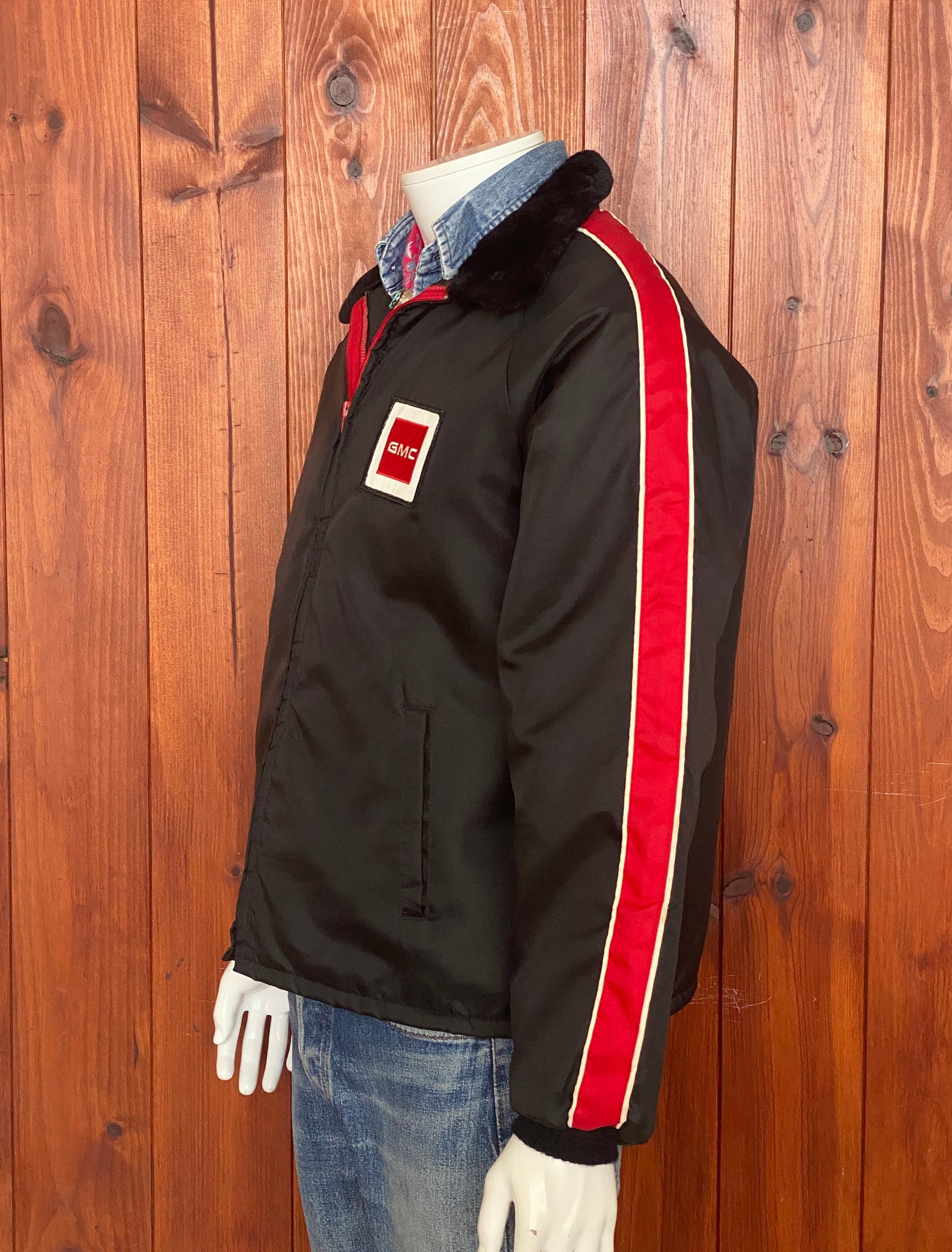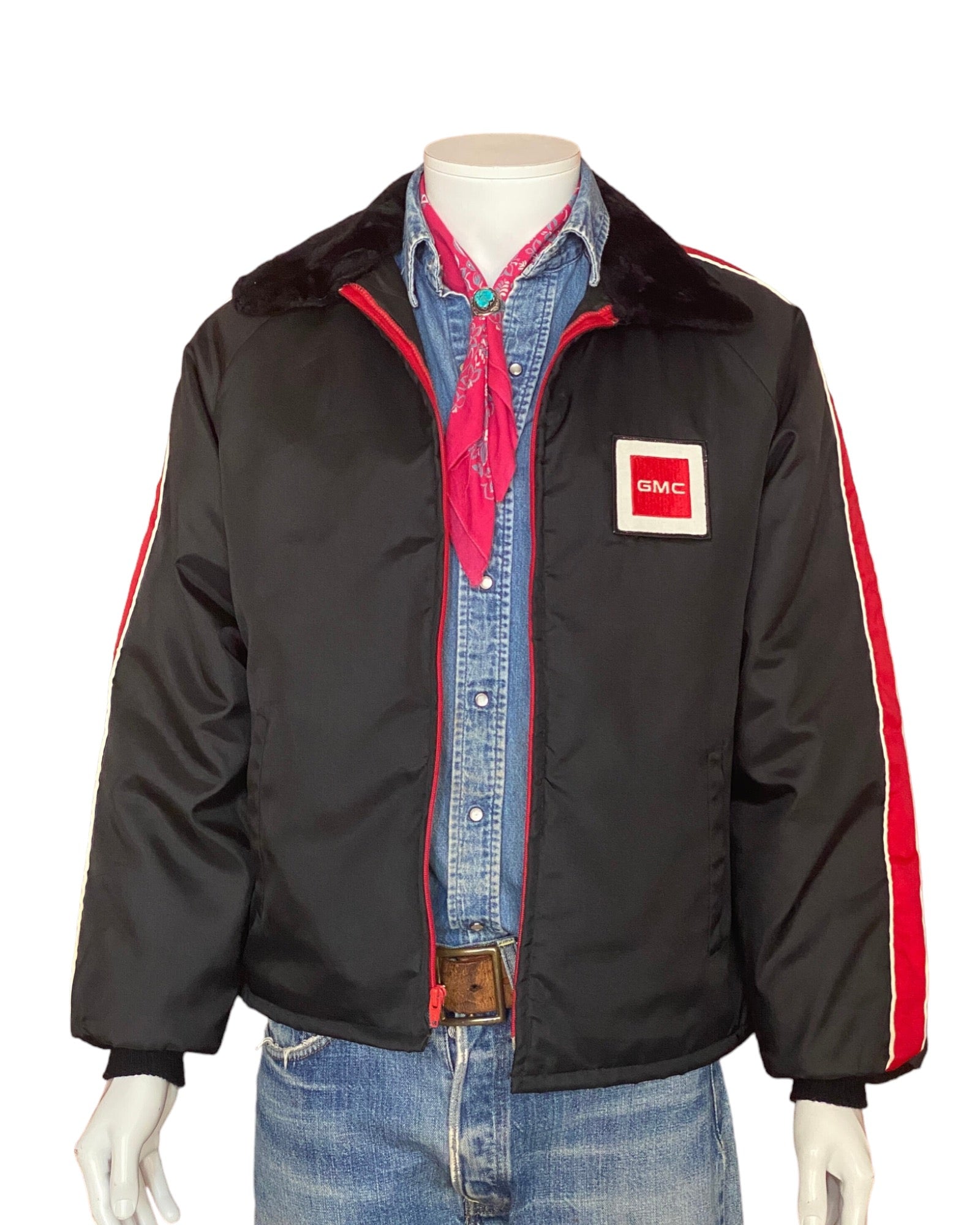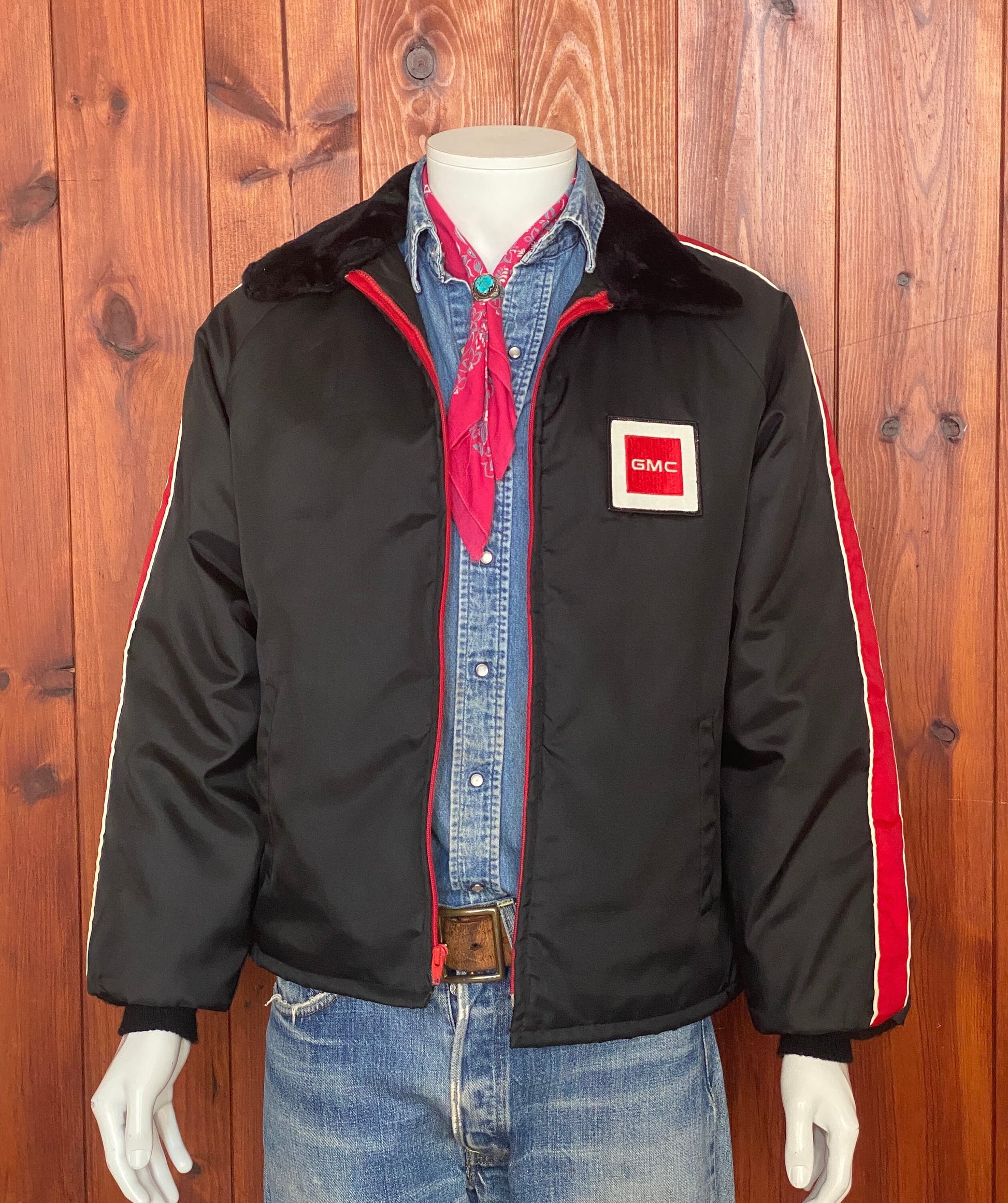 Description: vintage satin GMC quilted jacket with a fake fur collar made in the USA by Horizon sportswear.