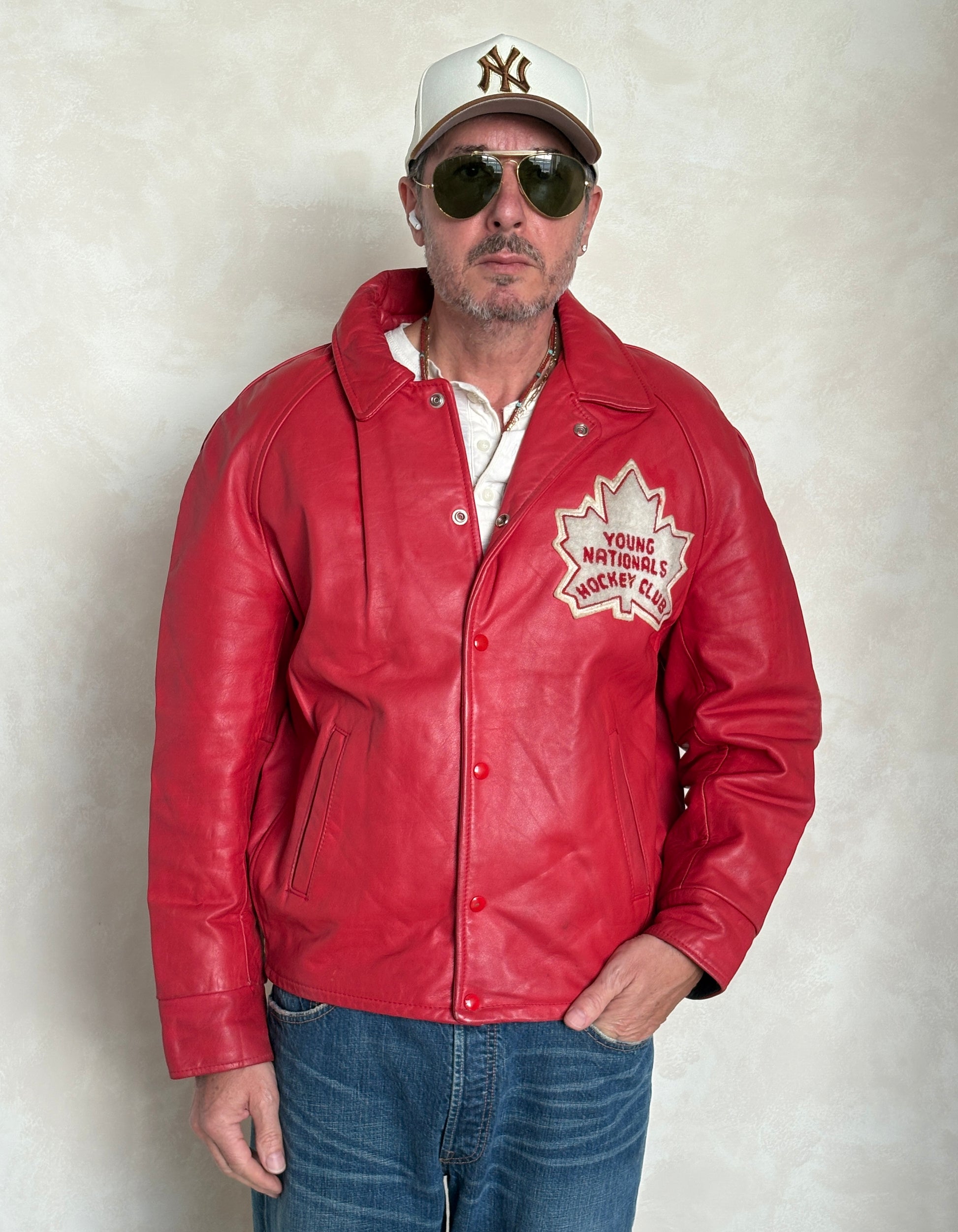 This vintage leather hockey jacket captures the true spirit of Canadian craftsmanship. Made in Canada from soft, genuine leather, it embodies authentic quality, timeless style, and the heritage of classic hockey culture.