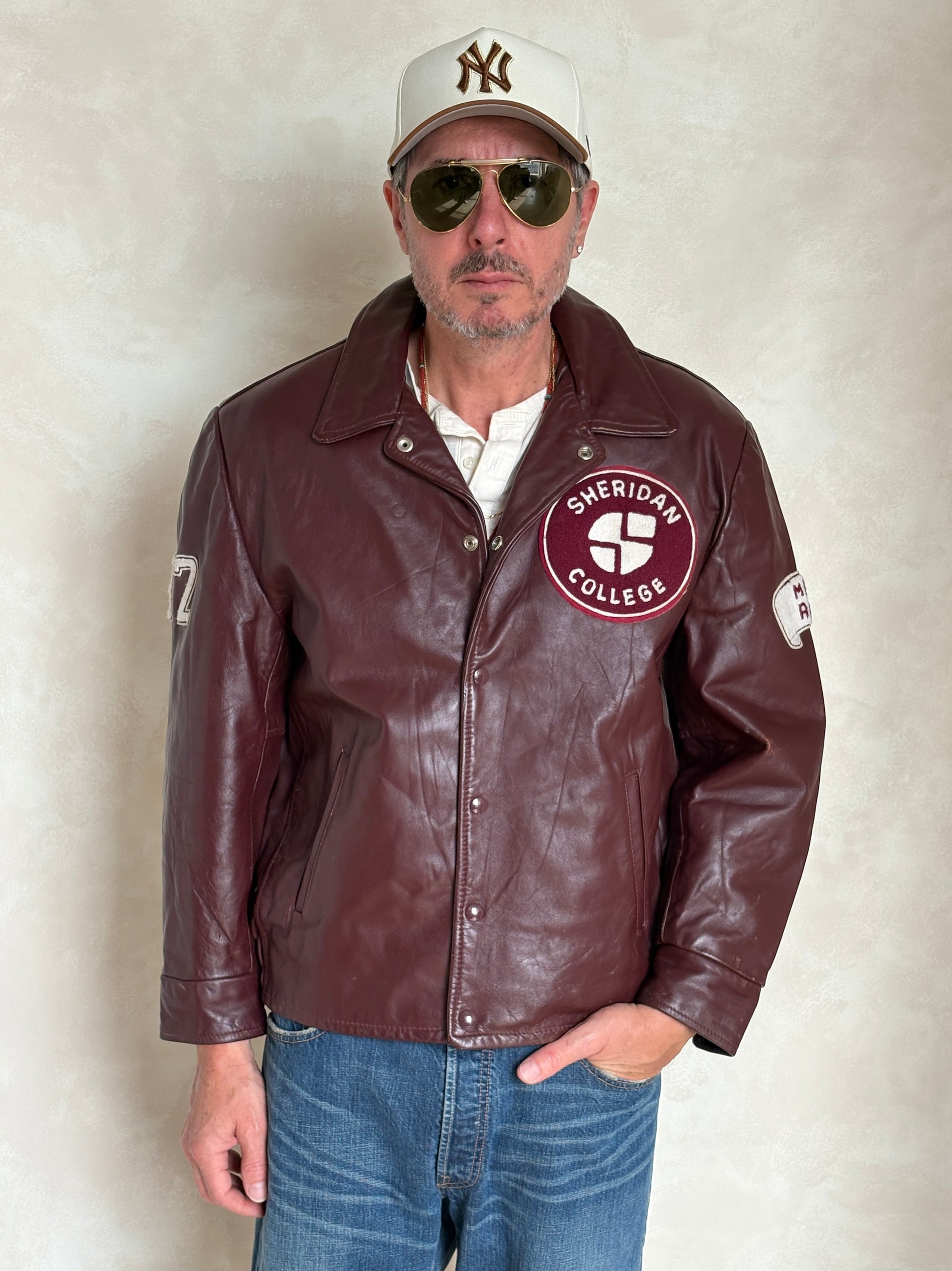 Vintage Canadian college leather jacket made in Canada from, genuine leather. A timeless varsity piece that embodies authentic craftsmanship and classic vintage style.
